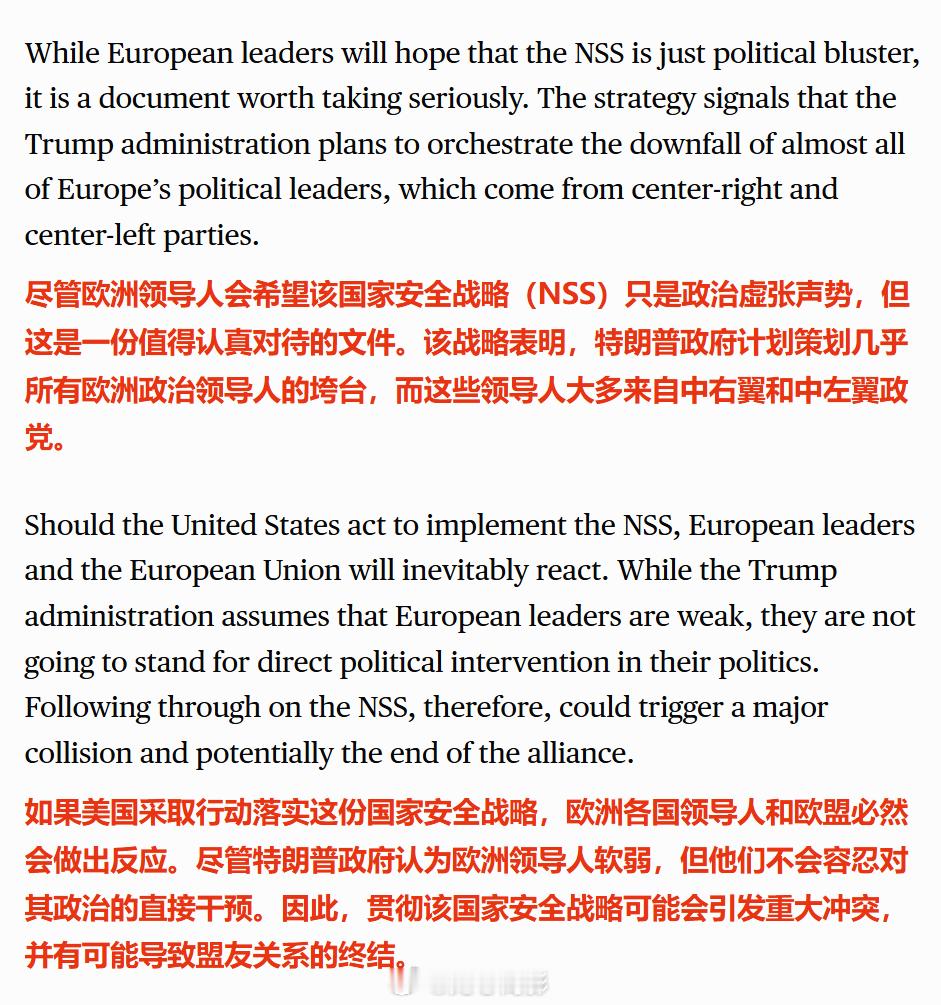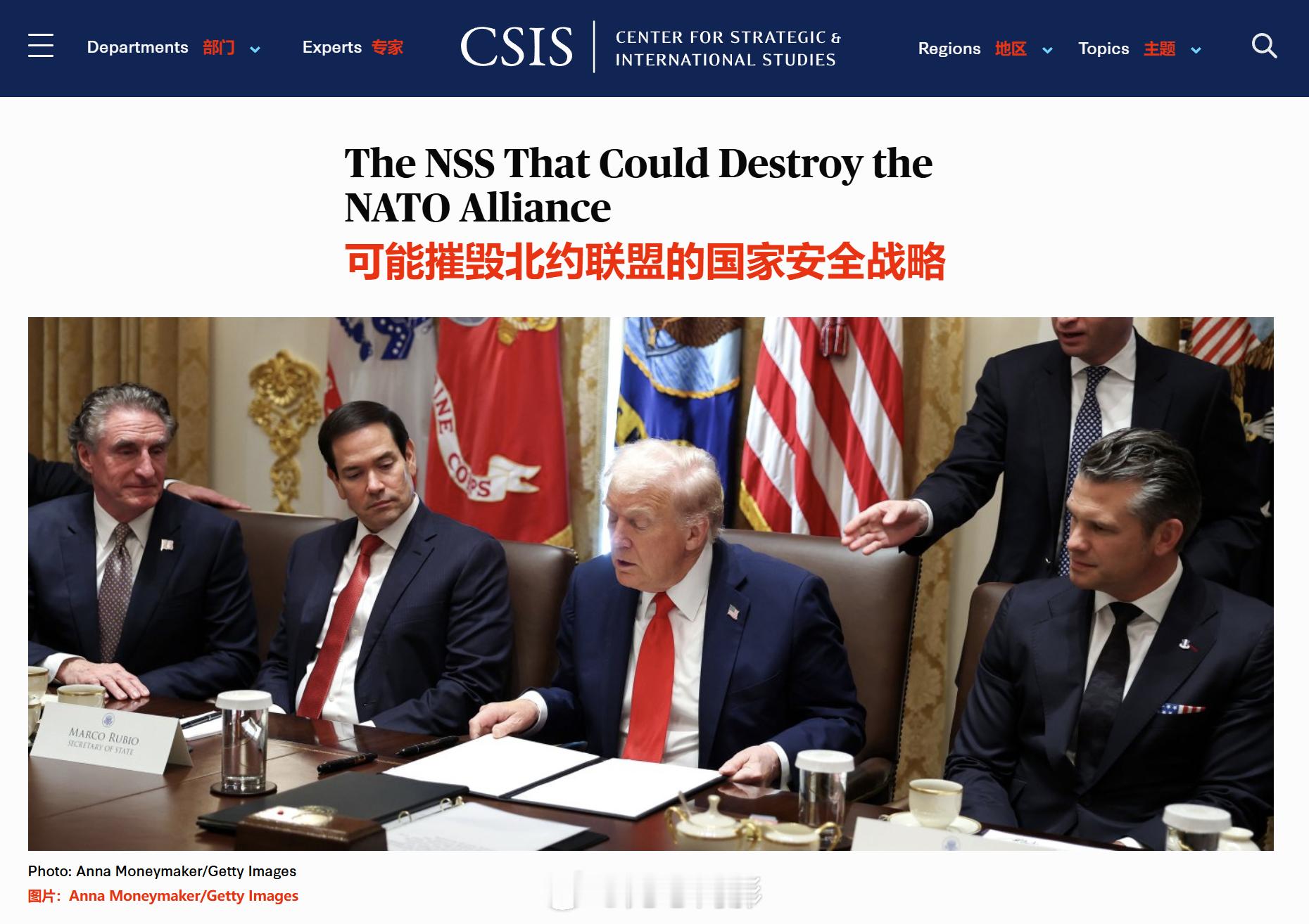 【美智库抨击新版“国家安全战略”,称可能导致北约瓦解】美国战略方向出现重大转变 位于华盛顿的美国两党智库战略与国际问题研究中心(CSIS)对周四发布的特朗普政府国家安全战略(NSS)进行了公开谴责,称该战略实际上“对欧洲政治、欧洲政治领导人和欧洲联盟宣战”,并补充说它可能导致北约联盟的瓦解。海外新鲜事