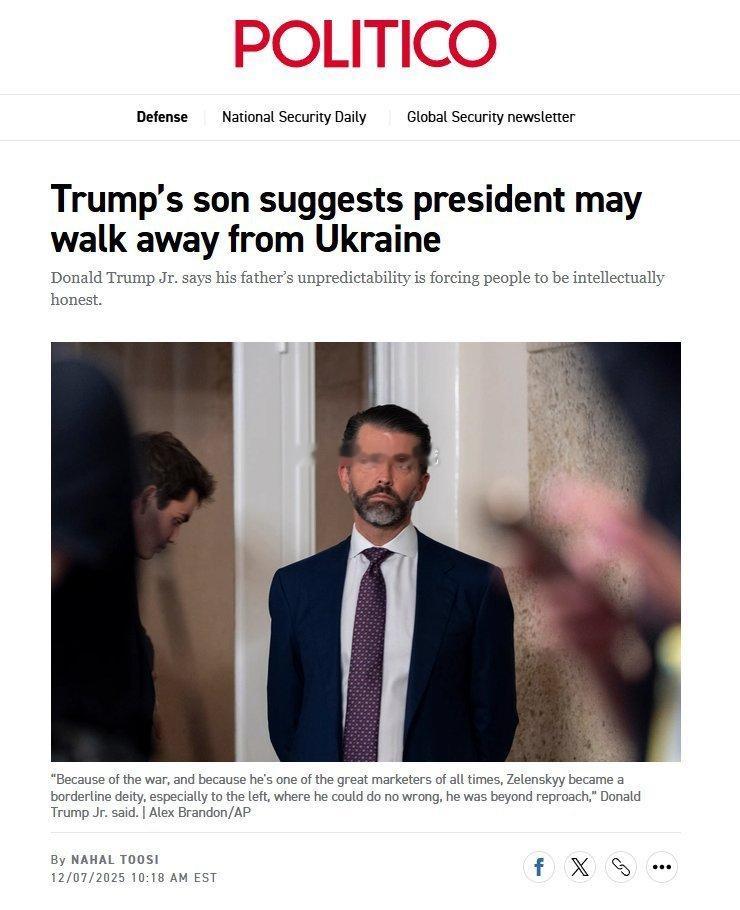小唐纳德·特朗普暗示,如果乌克兰未能达成和平协议,他的父亲可能会放弃乌克兰。他列举了基辅的腐败问题,并称泽连斯基是左翼“近乎神明”的人物。在多哈论坛上,小特朗普表示,他父亲的优势在于其行事难以预测,并警告乌克兰不要指望美国会无条件支持他。
