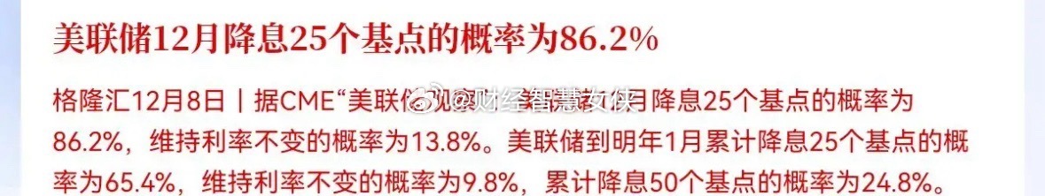 利好来袭!利好来袭!天还没亮,市场又传来两大新利好消息了!不出意外的话,今日A股要火力全开了,预计很多股民要提早下班了…利好一:早上6点20分,财联社最新消息,CME“美联储观察”最新观点:预计美联储12月份降息25个基点的概率为86.2%,预计2026年1月份接着降25个基点的概率为65.4%,近期美国疲软的宏观数据和特朗普的施压,迫使美联储本月降息的概率是越来越高,基本毫无悬念了!降息对于全球资本市场来说当然是利好利好二:国泰海通发布重磅研报,认为中国股市将进入跨年攻势,上升空间还很大,指数将迈上新台阶,并表示看好科技、大金融和顺周期三大赛道,国泰海通认为上涨的核心推动因素是,预计在年底A股将迎来政策利好、流动性充裕、基本面复苏三重利好,这份研报给了股民们信心,是一份值得重视的研报,值得反复细细品味!股民们,一大早!利好消息频繁出现,此刻股民们也信心满满,已经迫不及待地等待着今日的开盘,预计在多项利好刺激下,今日大盘就要站上4000点,满仓的股民们,就等着大惊喜的到来吧!股票