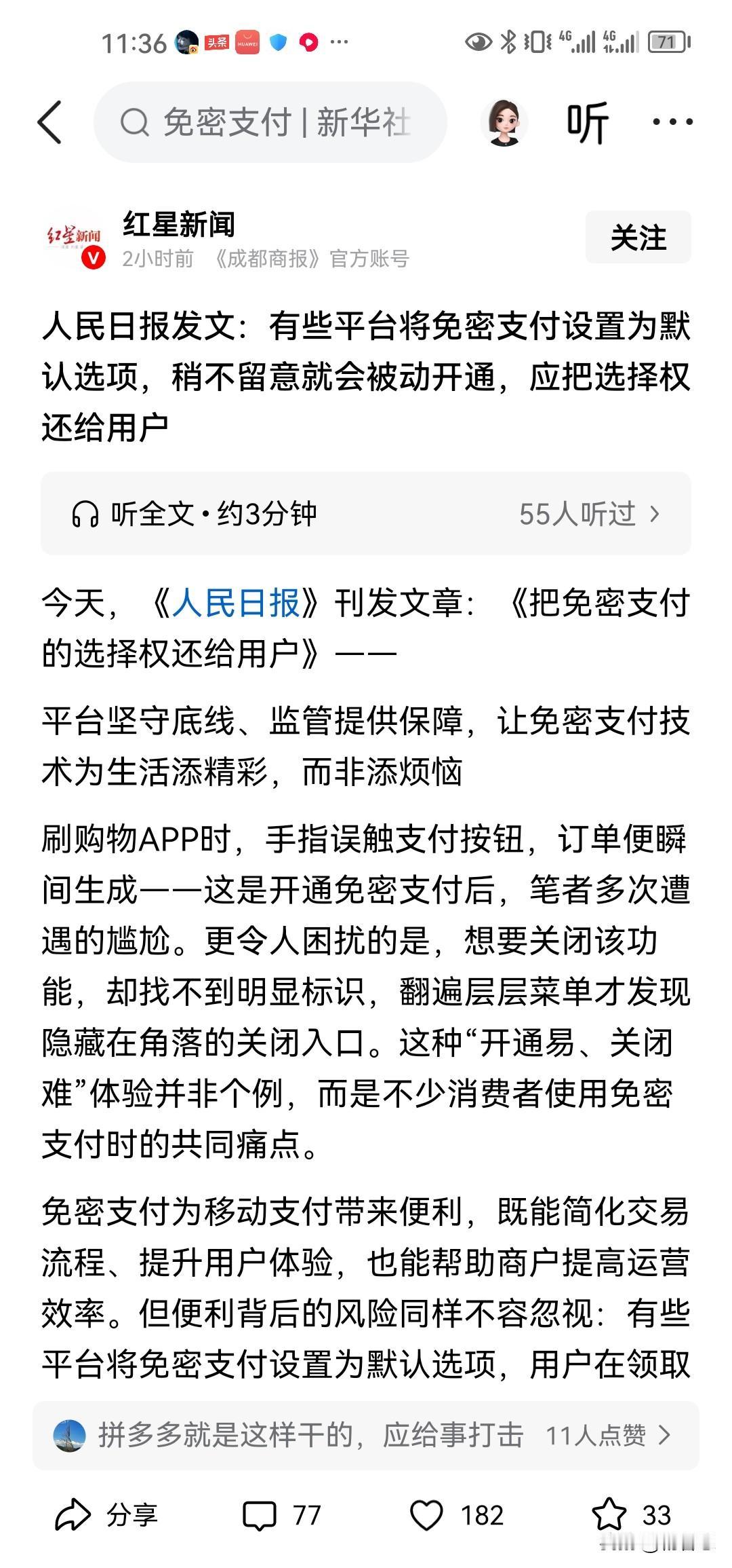 人民日报发文批评有些平台动不动就开通免密码支付,一不小心就加入陷阱里去了。这点我也想批评一下抖音啊,我在抖音商场里买东西是动不动跳出一个什么小额免密码支付,还有动不动引诱开通什么月付,根本就没必要,总是跳出来,好麻烦,一不小心就点进去了,不能为了平台的赚钱就底线给抛弃掉了。我这么说了,我也不怕头条平台把我屏蔽掉,我在抖音买东西是因为我经常玩头条,我想安心买点东西,而不想到处有陷阱。
