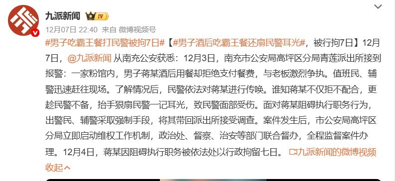男子酒后吃霸王餐还扇民警耳光 这就是自己找别扭了!一是酒后闹事本事就不对,二是竟然还敢袭警那是妥妥违法甚至犯罪行为,三是打民警耳光是一种污辱人行为更应严惩。很多人喝醉酒确实避免不了,但一定要有德能控制住自己,喝多了就赶紧睡觉去,别到处惹事。想与警察对着干,最终吃亏的是自己。
