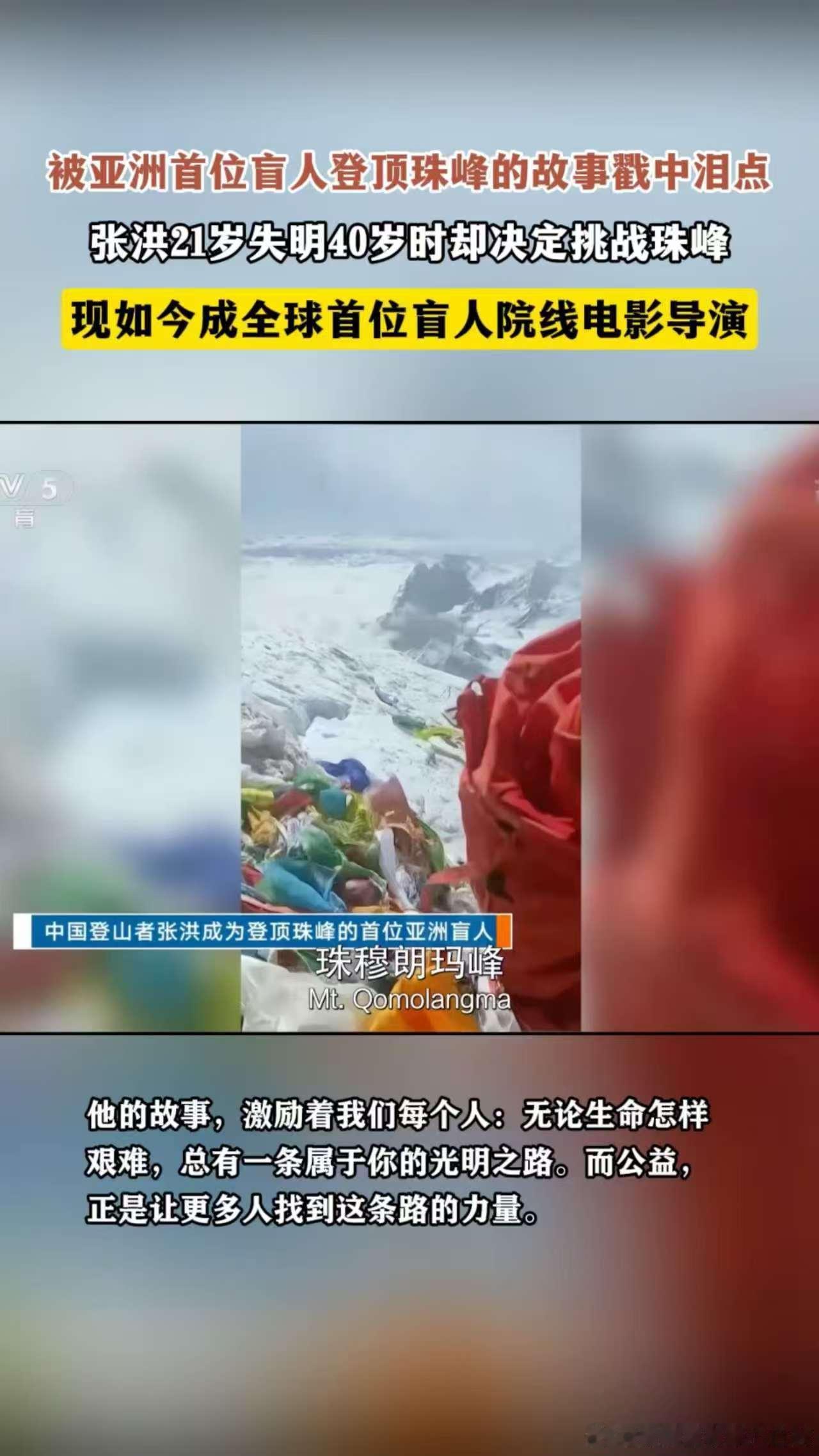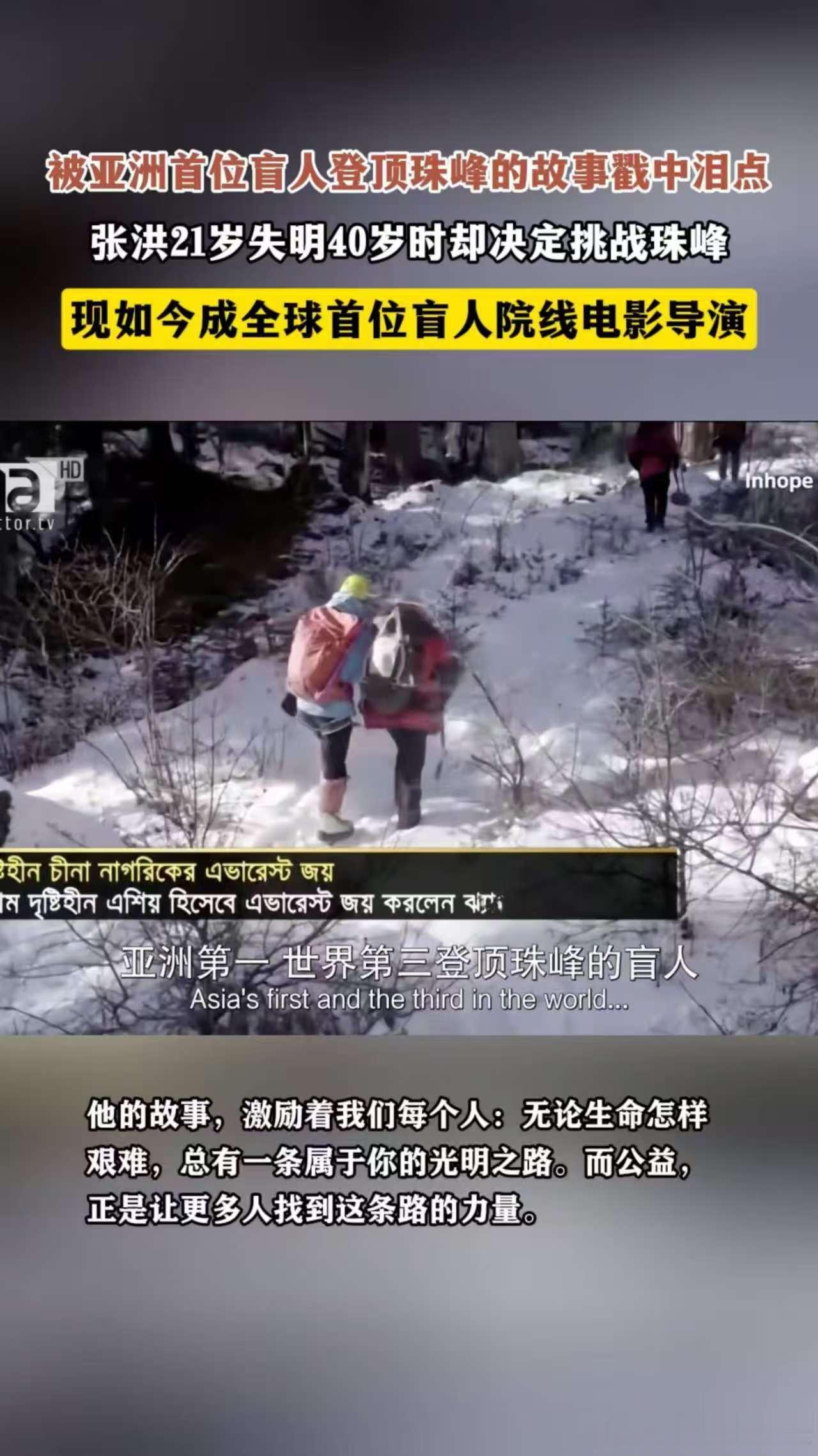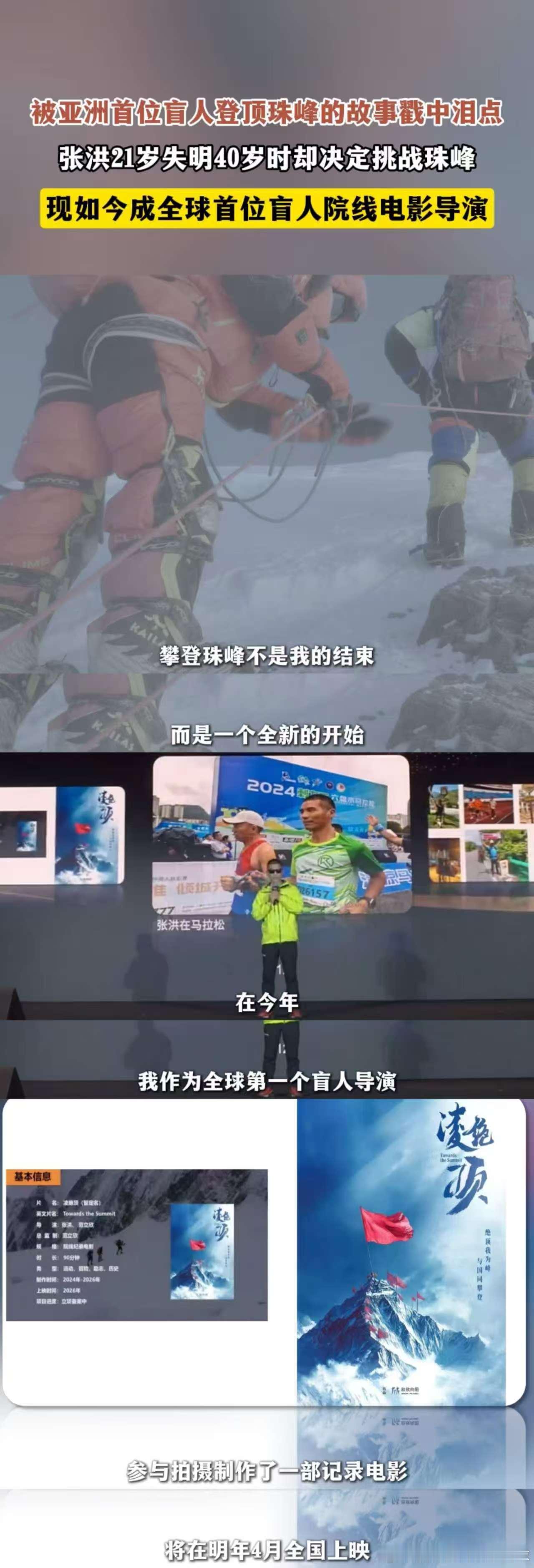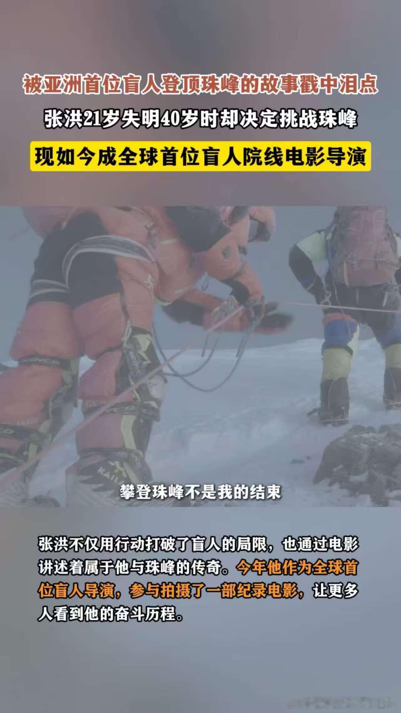 亚洲首位盲人登顶珠峰的故事太燃了看不见峰顶的光,却活成了照亮无数人的光✨!亚洲首位盲人登顶珠峰的张洪,又解锁全球首位盲人电影导演身份,把黑暗里的攀登,拍成写给世界的滚烫情书