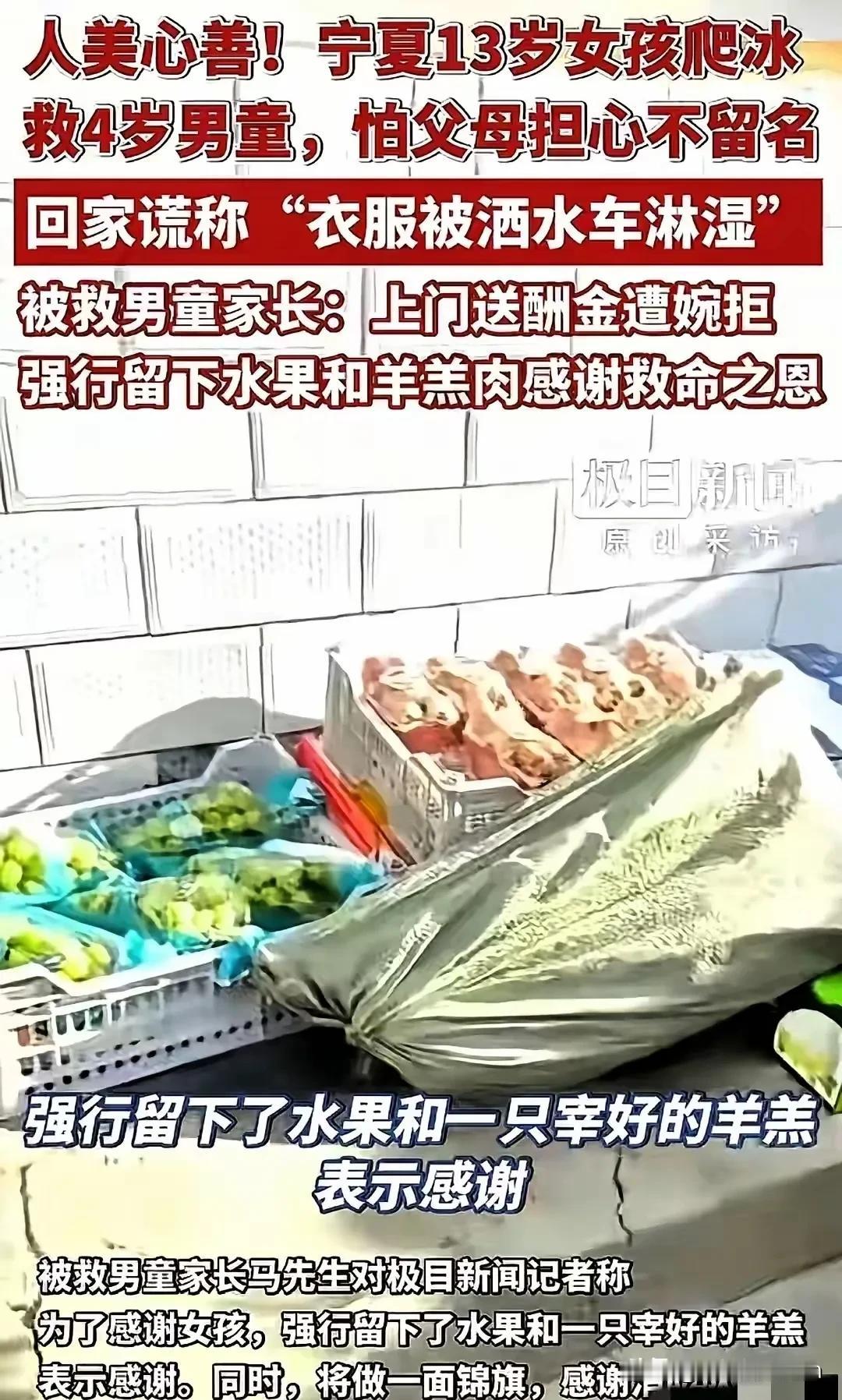 宁夏13岁女孩李佳婷救起的4岁男童的家长,上门给救命恩人送来了酬金、水果以及一只宰好的羊羔肉! 上门的是男童父亲马先生,那天看着孩子从冰窟里被抱出来时,他腿肚子都打颤,这几天夜里总梦见孩子在冰水里扑腾,醒了就抱着孩子掉眼泪。谢礼是早早就备下的——酬金是想让佳婷买点暖和的新衣服; 那只宰好的羊羔,是宁夏同心这边谢大恩才会拿的礼,马先生专门托人挑了最肥的一只,就想让佳婷一家尝尝最实在的心意。他进门时,手里攥着信封,身后亲戚帮拎着沉甸甸的羊羔,嘴张了好几次,才憋出一句:“要是没佳婷,我家娃这事儿,我真不敢想。” 佳婷爸妈赶紧把人让进屋里,刚接过马先生递来的信封,一摸是钱,立马推了回去。佳婷妈攥着马先生的手腕,语气又急又诚:“可不敢收这个,孩子就是瞧见那小娃可怜,没想别的。 前几天她湿着衣服回来,说被洒水车淋了,我们还骂她不小心,后来知道是救了人,心疼得一宿没睡好,哪能借着这事儿收钱?”佳婷爸也搭话:“这闺女从小就佩服消防员,说长大了要当能帮人的人,今天这事,就是她往那方向走的一小步,我们当家长的,骄傲还来不及,哪能要酬金?” 马先生哪儿肯依,把信封往桌上放,又被佳婷爸拿起来塞回他口袋,来回推了好几回,马先生眼眶都红了:“我知道你们不是图钱,可这是我的心意啊!佳婷是我家娃的救命恩人,我总不能空着手来。” 佳婷爸妈还是摇着头,马先生没办法,只能把信封揣回兜里,拽过水果筐和羊羔:“那这两样您总得留下!水果是自家的,羊羔也是刚宰的新鲜货,您要是不收,就是嫌我不懂事,往后我都没脸见你们。” 佳婷这时候正躲在卧室门口偷偷看,听见这话小声搭腔:“叔叔,我真没干啥,就是那弟弟哭得太厉害,我想着赶紧把他拉上来。” 她说完挠了挠头,脸有点红——那天爬冰的时候,冰面咯吱响得吓人,她脚都有点抖,但看见小娃伸着小手哭,就什么都顾不上了。现在看着马先生这么郑重,她倒有点不好意思了。 最后佳婷爸妈没法子,只能叹着气收下了水果和羊羔,送马先生出门时反复说“以后让孩子常来玩,都是街坊,别这么见外”。马先生走的时候脚步轻了点,像是心里压着的石头落了地。 这事儿里没什么复杂的弯弯绕,就是一个小姑娘凭着本能伸出手,救了另一个孩子的命;就是被救的家庭掏心窝子想报恩,不想让善意落空; 就是救人的家庭认死理,觉得善意不该用金钱衡量。这是最朴素的人情,也是最暖的温度——当善意遇上知恩,当真诚对上坦荡,就能把一件险事,焐成人心底的热乎气。 各位读者你们怎么看?欢迎在评论区讨论。