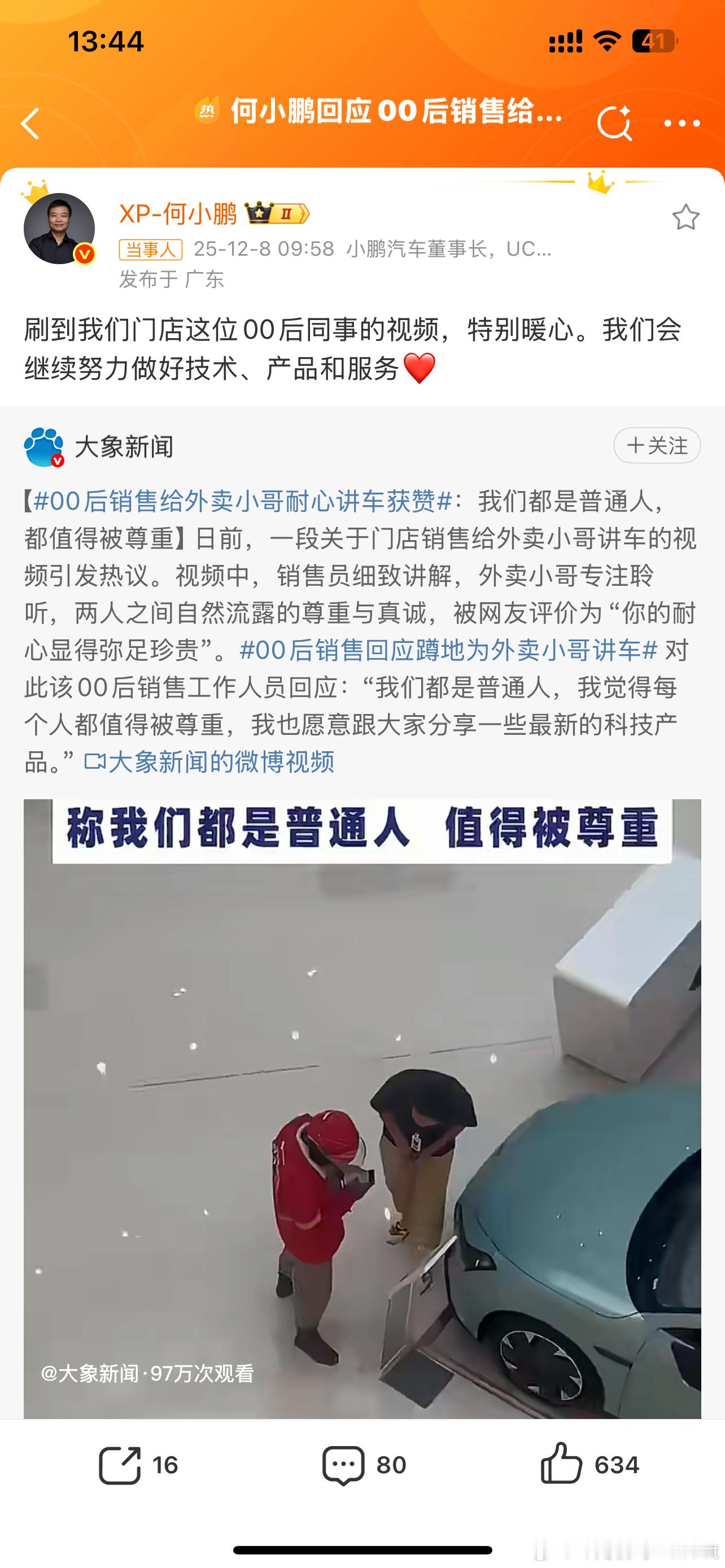 何小鹏回应00后销售给外卖小哥讲车职业无分贵贱抛开职业大家都是消费者只要打开门做生意就得服务好每一个进店客户很明显,00后小哥是将小鹏这种服务精神完全贯彻到位的