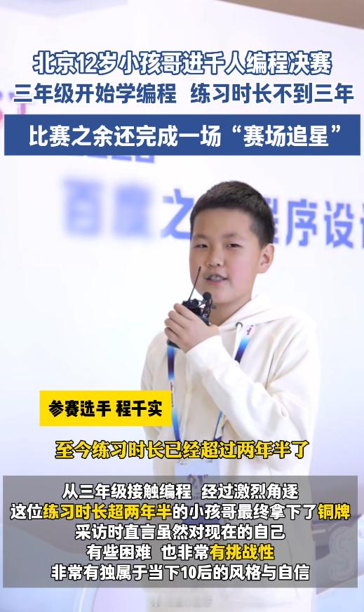 北京12岁小孩哥进千人编程决赛青少年编程的重点不在于学习编程软件的使用和编程语言,而在于思维的锻炼,更好的思考和解决实际问题才是关键。北京小孩哥混入清北赛场