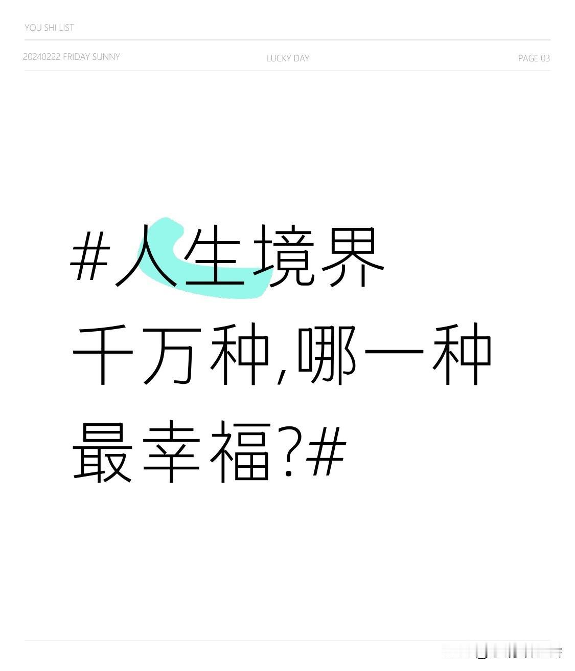 人生境界千万种,哪一种最幸福? 人生境界千万种,哪种最幸福还真没标准答案。不过有几种被广泛认可的境界。 中国哲学追求的“天人合一的安顿”就很棒,像孔子说的“从心所欲不逾矩”,内心秩序和自然、社会秩序高度统一,不再和自我、他人、世界对抗,顺境逆境都能平和从容。 还有心理学家提出的心流体验,全身心投入一件事,进入忘我状态,时间感消失。比如画家专注创作,运动员全力比赛时,那种沉浸其中的快乐难以言表。 我觉得幸福就是找到内心的和谐自足,不管是哪种境界,能让自己内心安宁、快乐,那就是属于自己的幸福境界。