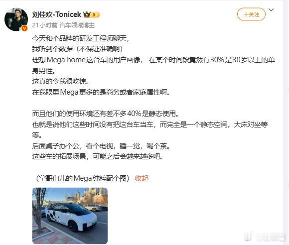 理想Mega home这台车的用户画像, 在某个时间段竟然有30%是30岁以上的单身男性。推荐大家,可以知乎搜索一个问题:男人的快乐有多简单,如果能理解男人的快乐,那也就能理解这个数据