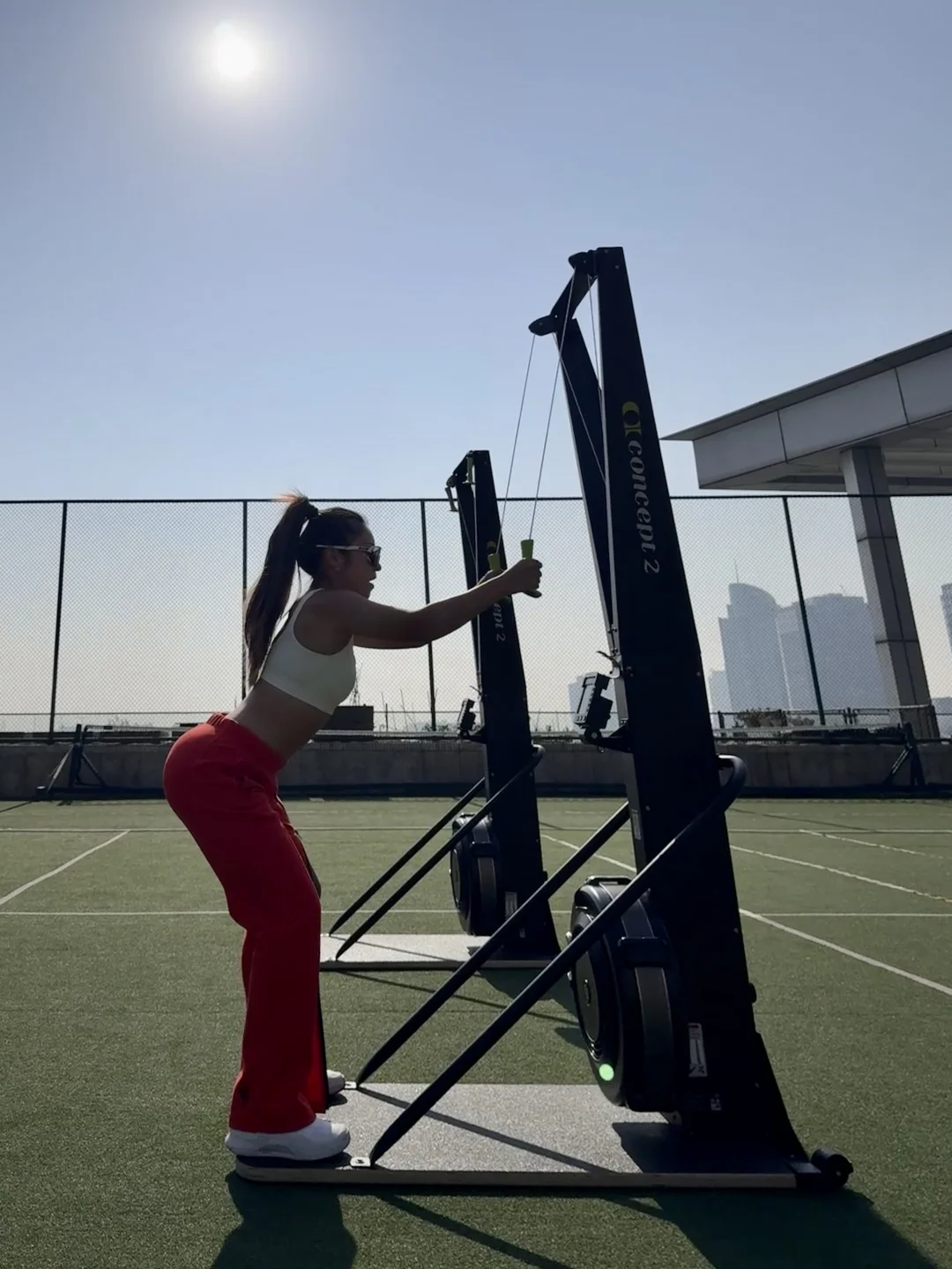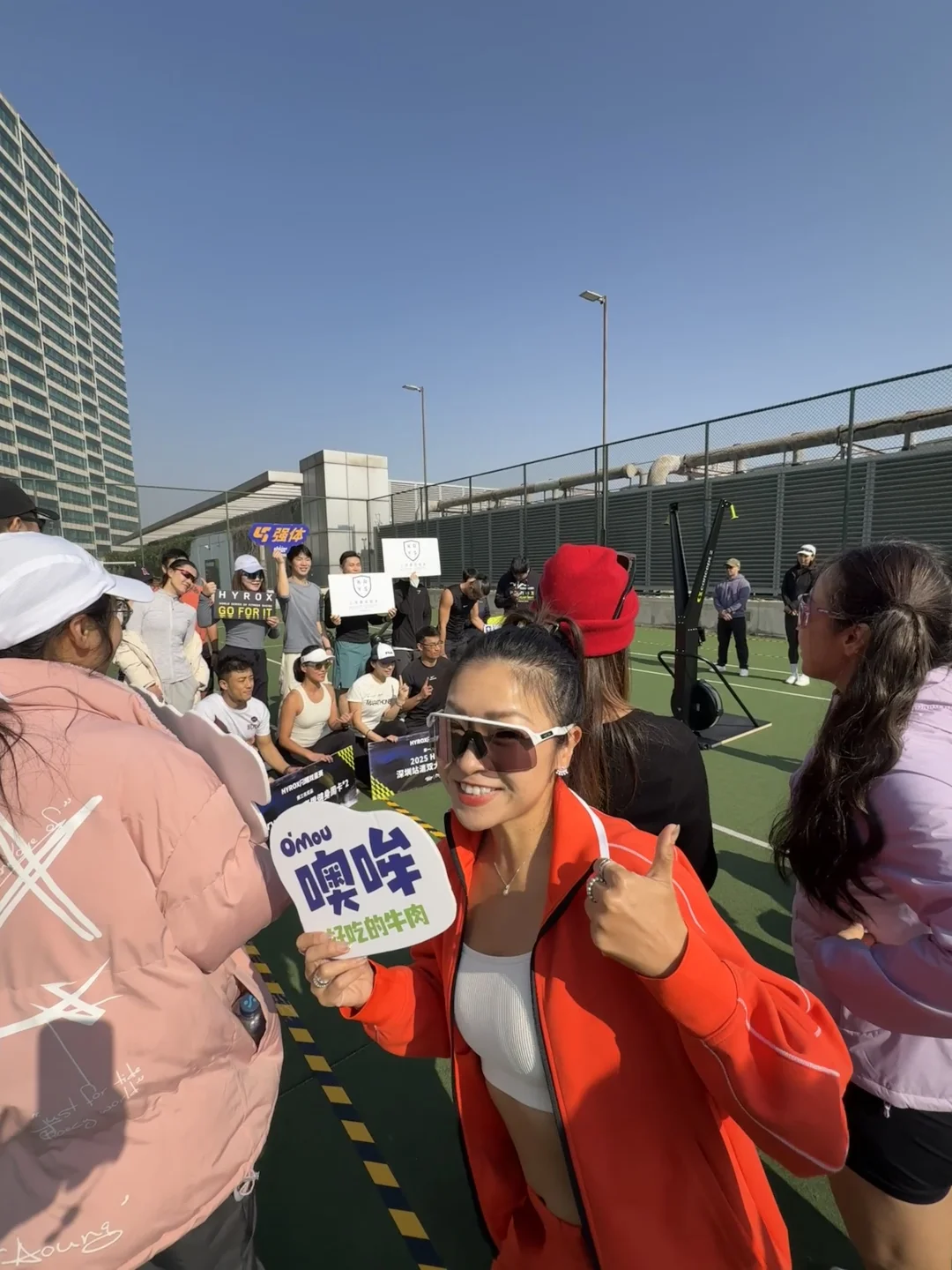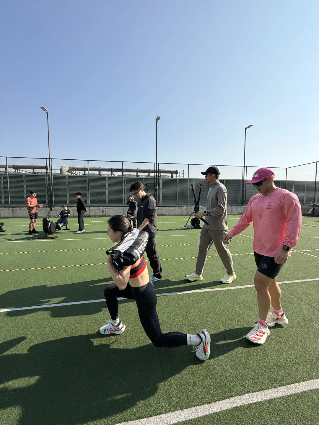 热身完就直接冲到5楼的室外网球场,气氛已经燃炸了!这是ShineWith社群和浦东嘉里健身一起搞的HYROX闪耀双星赛,复刻了风靡全球的室内健身跑赛事。和我以前看的比赛不一样,Hyrox是跑步+体能挑战交替着来,对耐力和力量都是终极考验。