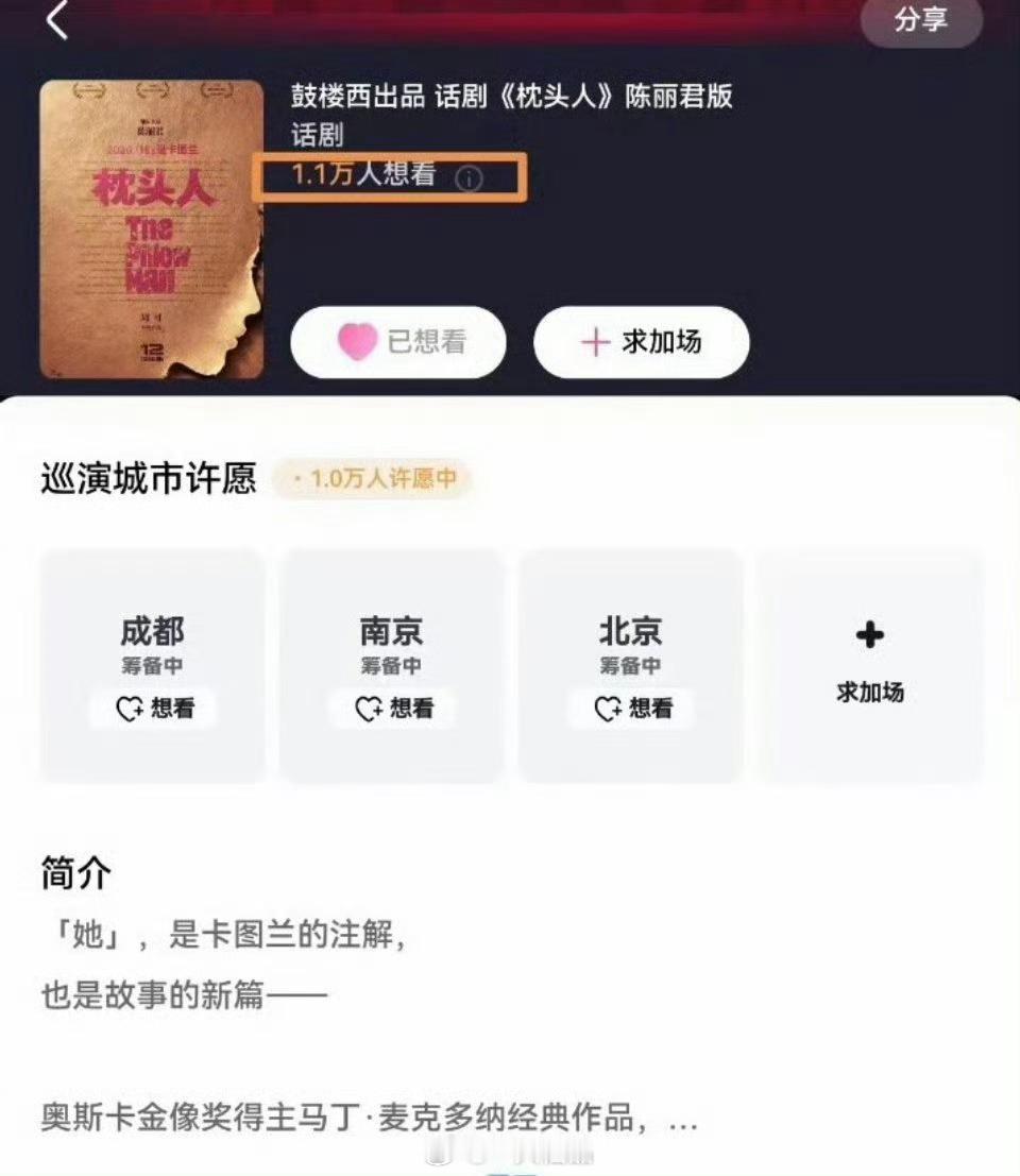 陈丽君新话剧《枕头人》想看人数破1.1万人了,这可是刚刚官宣呀!!!