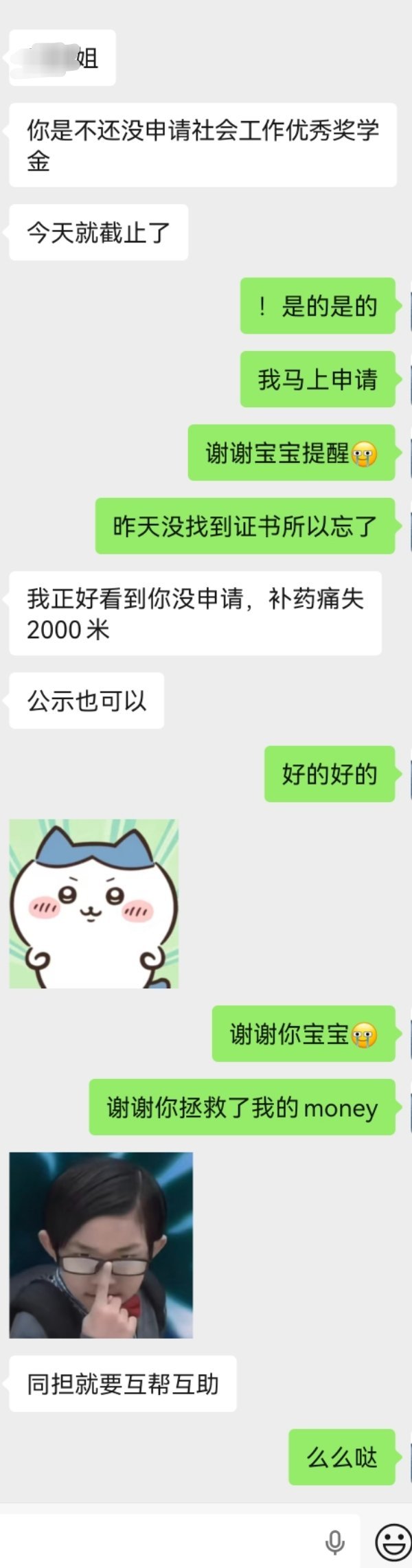 全世界都布满了优秀的同担就是这样好忘记申请奖学金了居然有之前从未发现过的同担+学妹来提醒,挽救我两千大洋