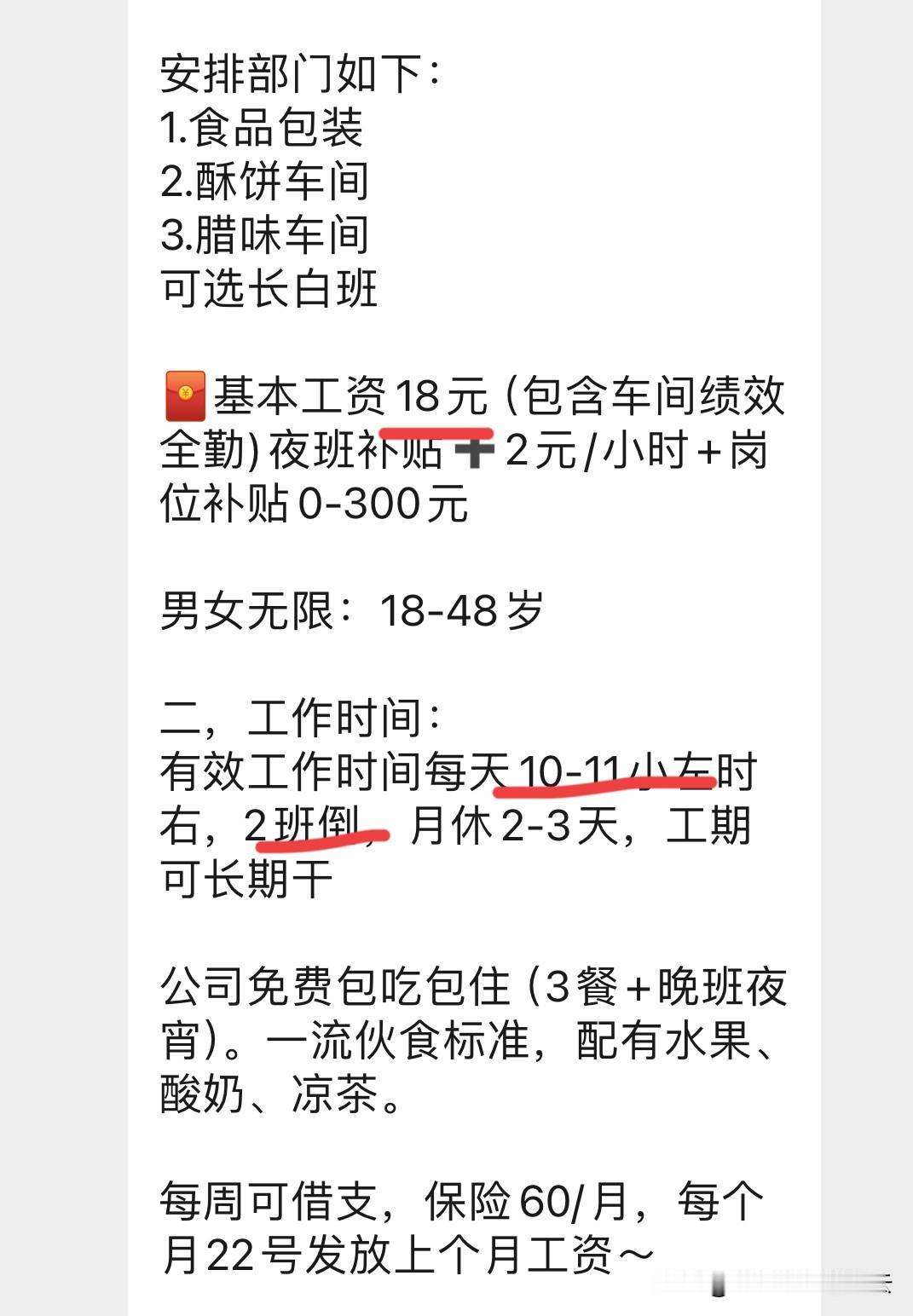 都2025年了,现在广州两班倒的工作单价竟然还不到20块钱, 当然了,这个是中介给到打工人的单价。 众所周知,中介介绍的工作岗位那肯定吃单价吃的比较厉害呢! 所以这个工资到了打工人手里没多少, 所谓生死两班倒,夺命流水线的工作一天十几个小时,累死累活下来也就200块钱一天而已…… 你们说,现在这个社会的生存成本有多高,竞争有多么的激烈呢? 就是在这样的大环境之下,又有多少人能一直靠吃身体吃时间,干这样的活呢? 那么毫无疑问,这样的工作基本上就是给年轻力壮的年轻人安排了! 中年人大多数也是吃不消工厂两班倒这样劳动强度的工作啊! 中年人他们的每天打工的收入估计比这个两班倒还要低很多呢! 有没有?[灵光一闪]