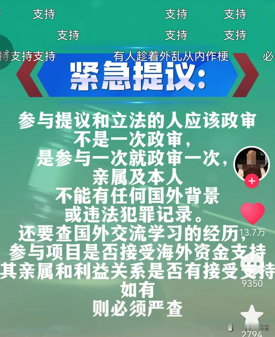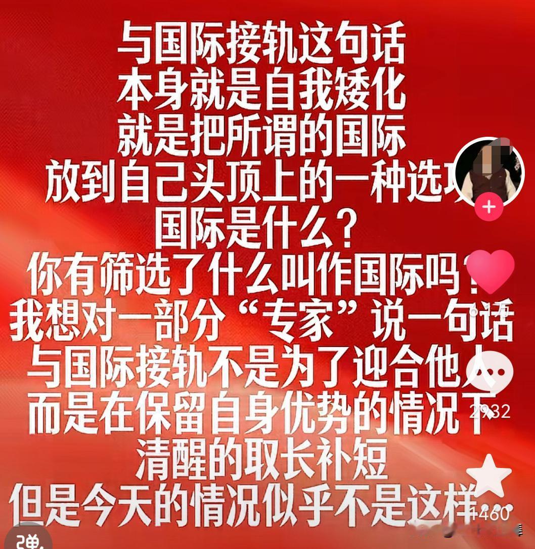 可能很多人刷视频极少点赞,我也一样,除非看到真的很精彩或很认同的内容。这两天连续刷到知名学者和自媒体人卢X元,看到了他的两个观点,我为他点赞了。这先介绍第一个观点:“与国际接轨这句话,本身就是自我矮化。”“与国际接轨”,这句话是不是经常被看到?而且实际执行中也很多时候以这句话为指导方向。但仔细想一下,这话确实有毛病!它首先就把“国际”放在高于国内的地方,在思想认识和语境中,就把“国际”定义为“好的”、“对的”,所以应该向“国际”看齐,向“国际”学习;反而言之,不与“国际”接轨的,就是“落后的”或“不好的”。但事实上“国际”的就是好的、先进的吗?在30年前都未必是,在现在更是错得离谱!因为Z国的标注高于世界标准的东西不少,所以拿高标准的东西去与低标准的“国际”接轨,这本身就是种很可笑的行为! 第二个观点:参与提议和立F的人,应该Z审,而且不是只进行一次Z审,而是参与一次就审查一次。要求其亲属和本人,没有海外背景和关系,没有任何违F犯Z记录。还要查其有没有海外学习经历,以及参与的项目有没有海外资金的支持,亲属是否是利益相关方等。这一点讲的很清楚,这里就不过多解读。 个人认为,这样的观点值得点赞!因为它是满满的正能量。