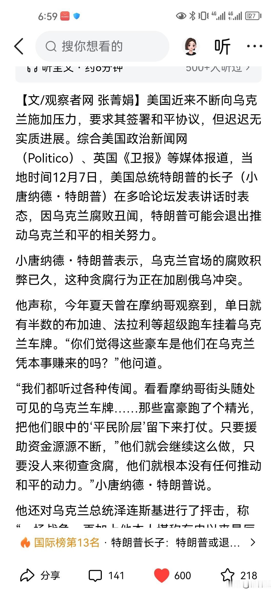特朗普的大儿子说特朗普不想再推动乌克兰的和平谈判了,是因为乌克兰腐败。小特朗普说他在国外看到很多乌克兰牌号的豪车,这些豪车怎么来的?就是通过腐败而来的,因为乌克兰自己没有能力拥有这么多钱,言下之意是乌克兰再不听话的话,特朗普就用非常手段了。当然了,这是共和党的算盘,民主党会反对,因为民主党与乌克兰的利益相关,相反共和党在乌克兰的利益还少一点。
