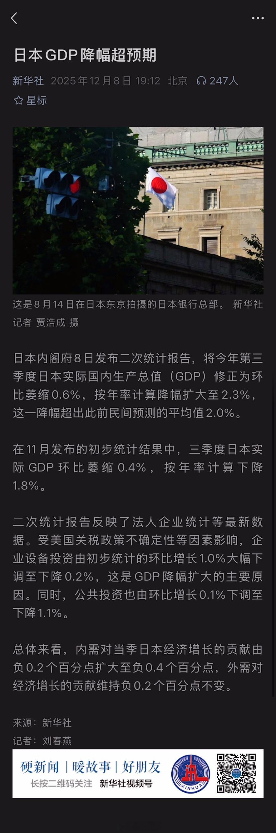 日本内阁府8日发布二次统计报告,将今年第三季度日本实际国内生产总值(GDP)修正为环比萎缩0.6%,按年率计算降幅扩大至2.3%,这一降幅超出此前民间预测的平均值2.0%。海外新鲜事