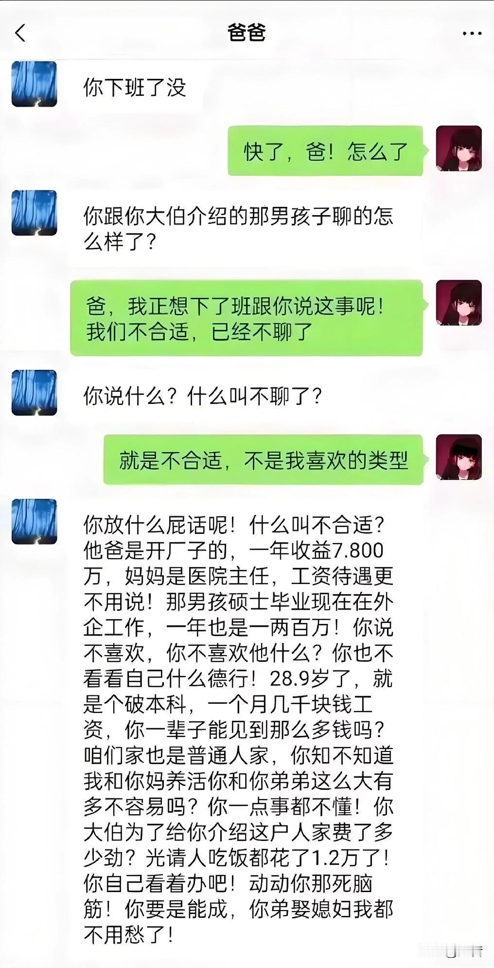 女人这一辈子! 最大的悲哀就不能选择自己喜欢的男人。 此图是一位老父亲和女儿的对话,老父亲为了钱逼着女儿嫁给不喜欢的男人,但老父亲的出发点是对的。 为人父母心,谁不想自己的女儿嫁一户有钱有地位的人家呢!再说女儿的年龄都有二十八九岁了,老父亲能不着急吗? 大龄剩女不结婚的问题就是这么来的,请问各位友友你们怎么看这个问题呢!欢迎各位友友留言讨论!