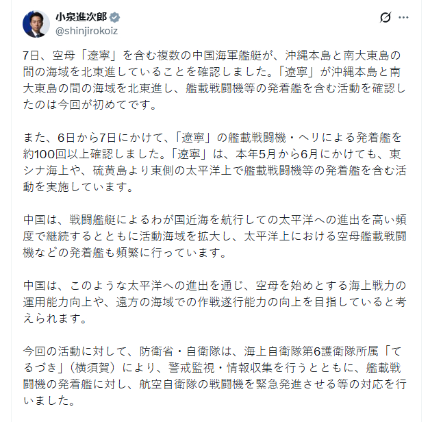 日本防卫相小泉进次郎再次发布信息,确认辽宁舰6日到7日舰载机和直升机出动超过100架次。