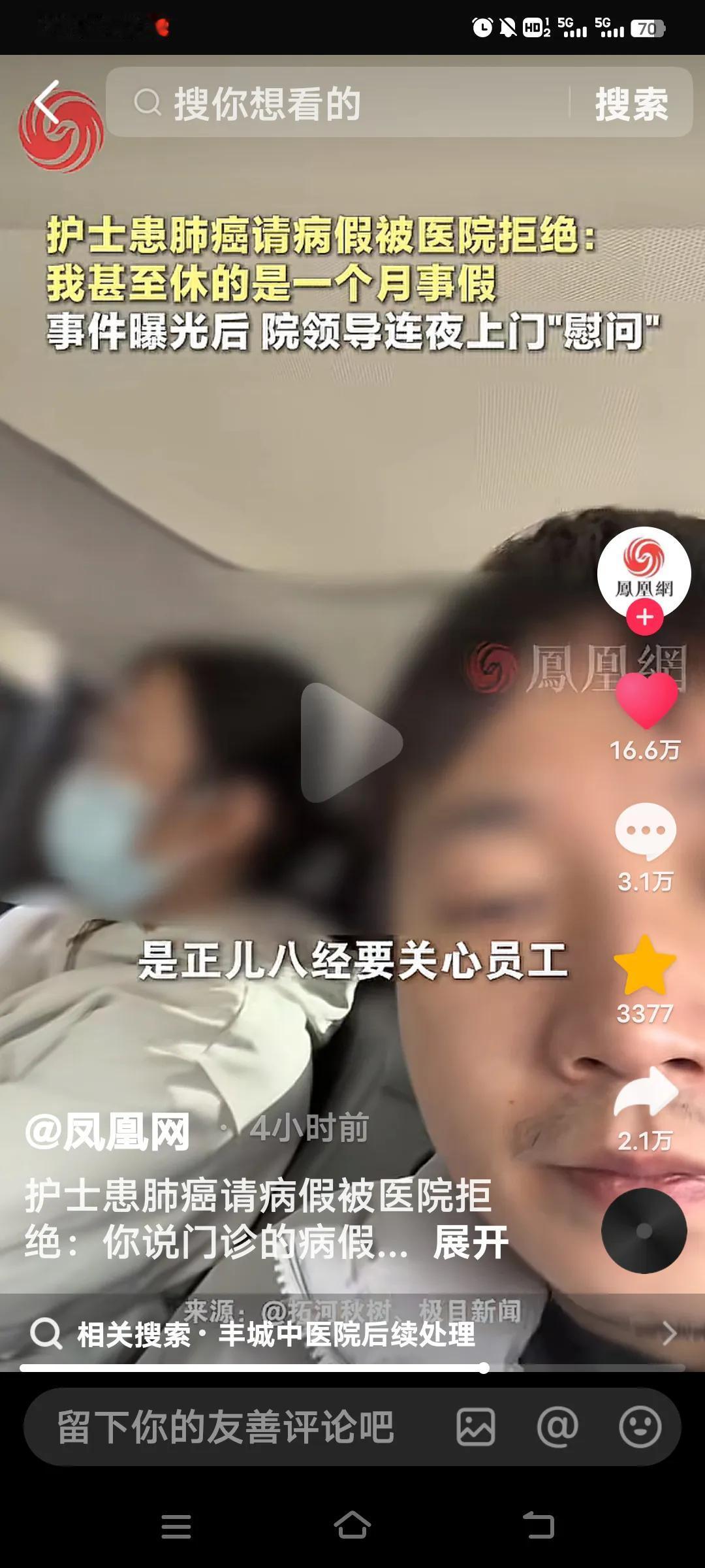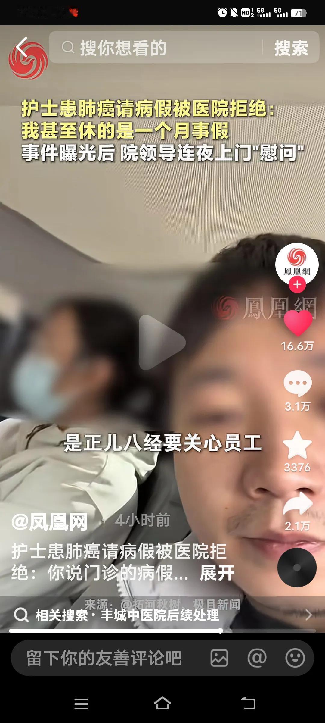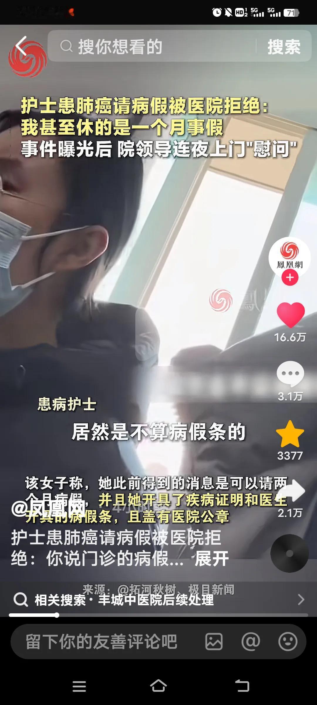 这也太不合理了!护士患肺癌请假,竟被医院拒绝,而且休一个月假还按事假处理! 这位患病护士在丰城中医院工作了五年,就算没功劳也有苦劳。护士说自己身上烂了两个洞,反问“我还能上班吗”。事件曝光后,医院领导上门“慰问”,还在凌晨12点打电话骚扰。这哪里是关心病人,分明是为了自己!简直太奇葩了! 这可不是普通的头痛感冒,是肺癌啊,难道非要让她“战死沙场”吗?一点怜悯之心都没有!这样的医院领导必须严惩,怎么能做出如此荒唐之事!肺癌医生 职业性肺癌 请病假理由