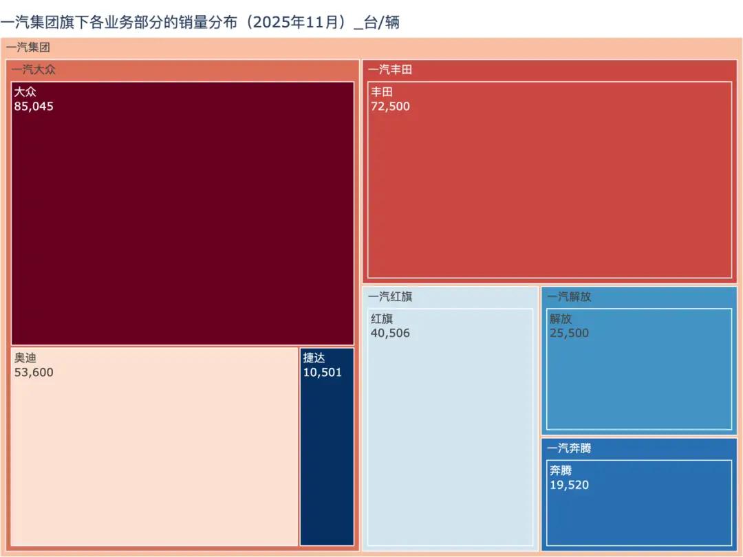 一汽现在的盘子太大,血液太老,想要革新,非常困难,集中于3点:合资依赖深、自主造血弱、新能源转型滞后。2025年11月30.6万辆总销量中,合资品牌占22万辆,占比超7成,红旗、奔腾等自主板块虽有增长,但规模效应不足,且智能座舱、高压平台等核心技术缺失,央企决策链条长导致市场化反应迟缓。同时,新能源渗透率不足20%,远低于行业头部水平,商用车板块还面临利润暴跌、成本高企的困境。 破局需聚焦三点:一是深化合资技术转化,加速吸收大众MEB、丰田THS混动技术,反哺自主研发;二是强化资本协同,借力零跑架构与卓驭智驾技术,快速补齐大众新能源与燃油车智能短板;三是聚焦品牌差异化,红旗持续冲击高端新能源市场,奔腾深耕主流赛道,同时推进海外扩张与寒地新能源技术突破,摆脱单一市场依赖,构建“技术+品牌+生态”的多元增长极。