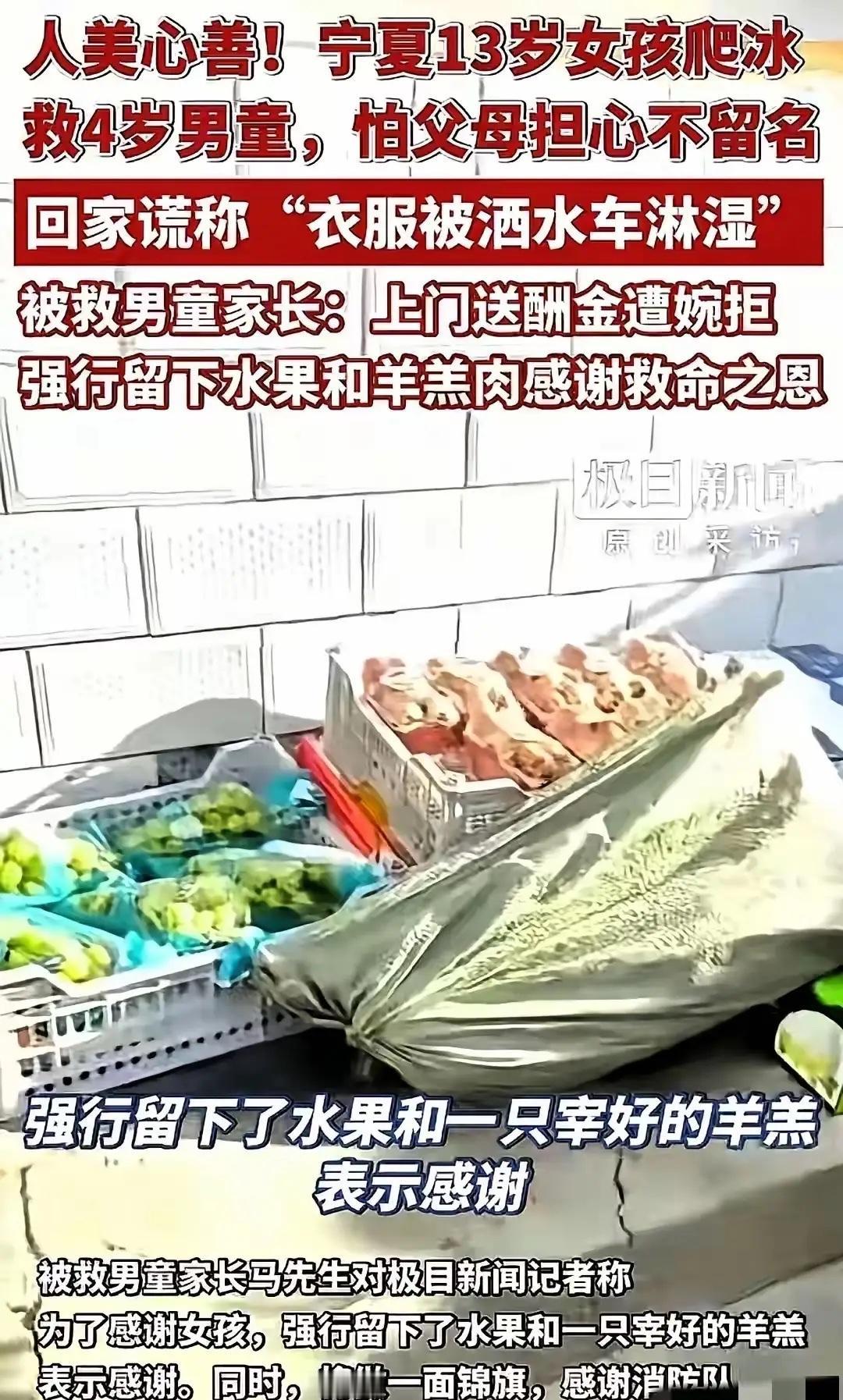 登门致谢! 宁夏13岁女孩李佳婷救起的4岁男童的家长,上门给救命恩人送来了酬金、水果以及一只宰好的羊羔肉,但是酬金被女孩家长婉拒,无耐之下留下了其它。 12月6日下午3点,宁夏吴忠市同心县的豫海湖边,刚放学的李佳婷正骑着电动车往奶奶家赶,风裹着寒气往领口钻,她把围巾又裹紧了些。湖边的冰面看着厚实,实则被暖阳晒得有些酥软,远处传来孩子的嬉笑声,李佳婷下意识瞥了一眼,就看见一个小小的身影突然踩空,“扑通”一声掉进了冰窟。 那是4岁的男童浩浩,跟着家人来湖边散步,趁大人不注意跑到冰上玩耍。冰水瞬间没过浩浩的胸口,孩子吓得哇哇大哭,双手胡乱拍打,冰面被震得咔咔作响,裂缝越扩越大。浩浩的家长疯了似的冲向湖边,却不敢贸然上前,只能趴在冰沿上伸手去够,可距离太远根本碰不到,急得直哭。 李佳婷二话没说,猛地刹车停稳电动车,脱下厚重的棉袄就往湖边跑。“阿姨别慌!我来救他!”她一边喊一边趴在冰面上,手脚交替着慢慢往前爬——小时候参观消防队时,消防员叔叔教的冰面救援知识,她一直记在心里。寒风刮得她脸颊生疼,冰面凉得刺骨,爬到浩浩身边时,她的手指已经冻得僵硬,却死死抓住孩子的手腕,一点一点往回拽。 浩浩吓得浑身发抖,紧紧抱住李佳婷的胳膊,体重加上恐慌带来的挣扎,让李佳婷每挪动一步都格外吃力。冰面时不时发出“咔嚓”的脆响,随时可能彻底坍塌,李佳婷咬着牙,拼尽全身力气把浩浩拖到安全的冰岸边,在家长的帮助下把孩子抱了上来。 看着浩浩被裹上棉袄,冻得发紫的小脸慢慢有了血色,李佳婷才松了口气,捡起自己的棉袄,骑着电动车默默离开了。回家后,她怕父母担心,只说衣服是被洒水车淋湿的,对救人的事只字未提。 浩浩的家长却记着这份救命之恩。他们通过湖边的监控找到了李佳婷的学校,又辗转问到了她家的地址。几天后,浩浩的爸爸带着妻子、孩子,拎着满满两大袋东西登门致谢:一袋新鲜的苹果、橙子,一只宰好的羊羔肉,还有一个厚厚的信封,里面装着5000元酬金。 “李师傅、张阿姨,太谢谢你们了!要是没有佳婷,我们家浩浩可能就没了!”浩浩的爸爸一进门就紧紧握住李佳婷爸爸的手,眼眶通红,“这是我们的一点心意,酬金你们一定要收下,羊羔肉是我们特意宰的,让孩子补补身体。” 李佳婷的爸爸连忙摆手,把酬金往对方手里推:“兄弟,心意我们领了,酬金绝对不能要。孩子救人是应该的,换了谁都会这么做,我们不能要这份钱。”李佳婷站在一旁,腼腆地说:“叔叔阿姨,我真的不用钱,浩浩没事就好。” 浩浩的家长急了,把信封往桌子上一放:“这钱你们必须收!佳婷是我们家的救命恩人,这点钱根本报答不了她的恩情。”双方推来推去,李佳婷的妈妈笑着说:“要不这样,水果和羊羔肉我们留下,酬金真的不能要。孩子还小,我们希望她知道,救人不是为了钱,而是出于本心。” 浩浩的家长见李佳婷一家态度坚决,只能无奈地收回酬金,把水果和羊羔肉留下。浩浩拉着李佳婷的手,仰着小脸说:“姐姐,谢谢你救了我,我以后再也不随便去冰上玩了。”李佳婷摸了摸他的头,笑着说:“以后要听爸爸妈妈的话,注意安全。” 这一幕被李佳婷的邻居拍了下来,发到网上后,网友们纷纷点赞:“这才是双向奔赴的温暖!救命之恩重如泰山,家长的心意让人感动,李佳婷一家的淳朴更让人敬佩”“不收酬金收了羊羔肉,既不辜负对方的心意,又守住了善良的本心,太赞了”“13岁的女孩勇敢善良,家长教育得也好,这才是最好的榜样”。 其实,李佳婷的善良和勇敢,离不开家庭的教育。她的爸爸说,从小就告诉她,做人要善良,遇到别人有困难,能帮就一定要帮。这次救人后,家里没有批评她冒险,反而为她的勇敢感到骄傲,但也反复叮嘱她,以后救人一定要先保证自己的安全。 浩浩的家长也表示,以后会经常带孩子来看望李佳婷,让孩子向她学习,做一个勇敢、善良、有担当的人。他们还在小区里分享了李佳婷的事迹,提醒其他家长看好孩子,不要让孩子独自在冰面玩耍,避免发生意外。 李佳婷的故事,就像冬日里的一束暖阳,温暖了无数人的心。她用勇敢的行动救了一条生命,用淳朴的品质拒绝了酬金,而浩浩家长的登门致谢,也让这份善良有了回应。在这个快节奏的社会里,这样的双向奔赴格外珍贵,它告诉我们,善良从来都不是单方面的付出,而是会相互感染、相互传递的正能量。 真正的善良,无关名利,无关回报,而是发自内心的关爱和担当。李佳婷用自己的行动诠释了这一点,而浩浩家长的感恩之心,也让这份善良变得更加温暖。希望这样的正能量能一直传递下去,让更多人愿意伸出援手,让这个世界变得更加美好。 各位读者你们怎么看?欢迎在评论区讨论。
