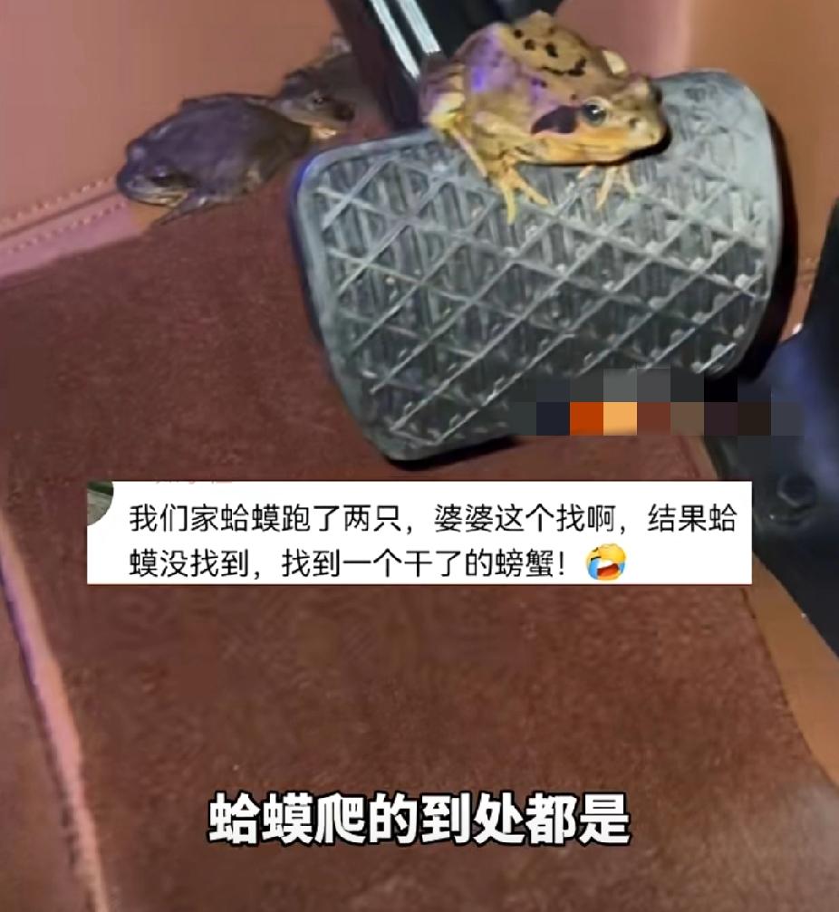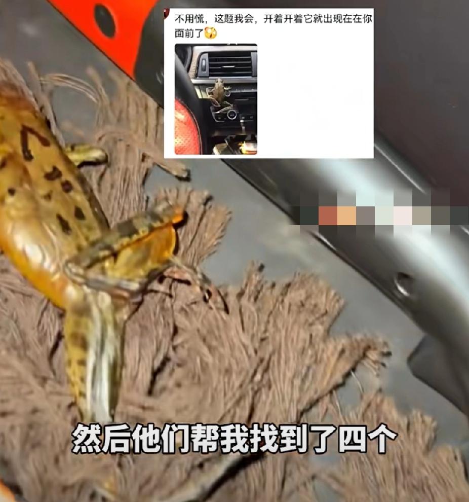 崩溃!12月7日,辽宁刘女士崩溃寻蛙,朋友送了一箱蛤蟆没拿下车,结果第二天蛤蟆蹦的到处都是! 据悉,这箱蛤蟆是朋友送给刘女士的,刘女士是想着第二天再吃,但是担心蛤蟆一直放在车里会闷死。于是女子撕开了泡沫箱子的胶布,给蛤蟆透透气! 结果第二天刘女士打开车门,发现蛤蟆都从箱子里蹦了出来,蹦的车里到处都是,将刘女士吓得不轻! 刘女士戴上橡胶手套,硬着头皮在车里将能看见的蛤蟆挨个抓起来。但还有很多蛤蟆隐藏在刘女士看不见的角落,在刘女士开车的时候蹦到刘女士脚上、方向盘上、车门框上,让刘女士一路崩溃着来到了4s店! 4s店的工作人员帮刘女士检查车辆的过程中又找到了四只蛤蟆!目前,还有四只蛤蟆没有找到! 崩溃