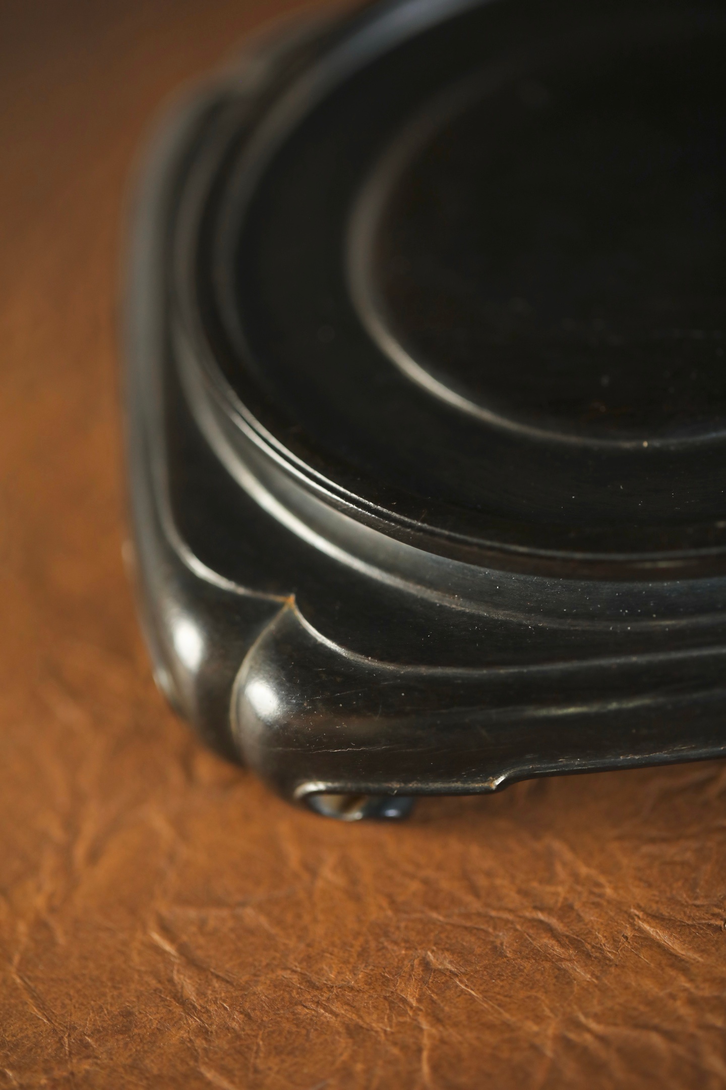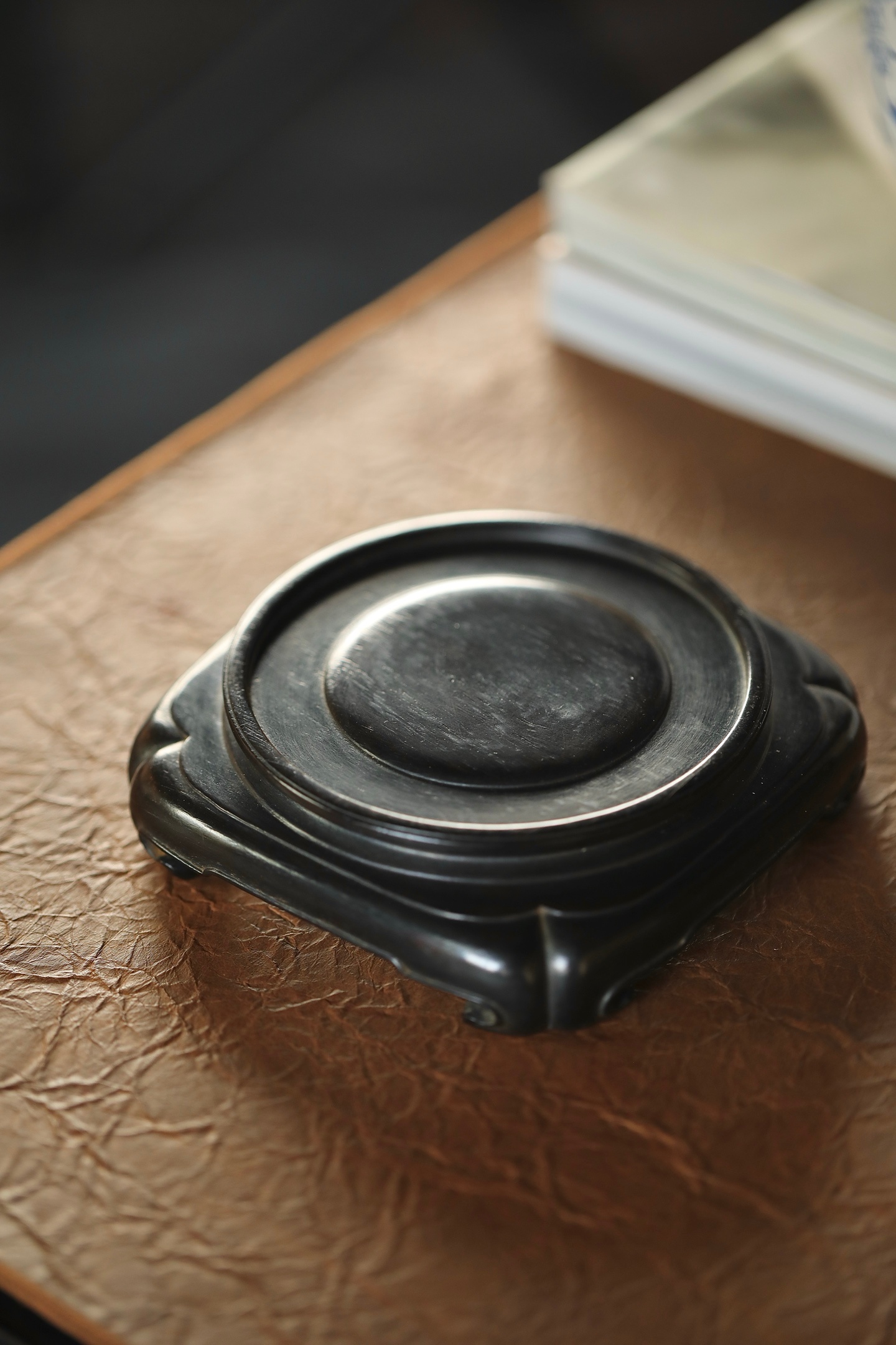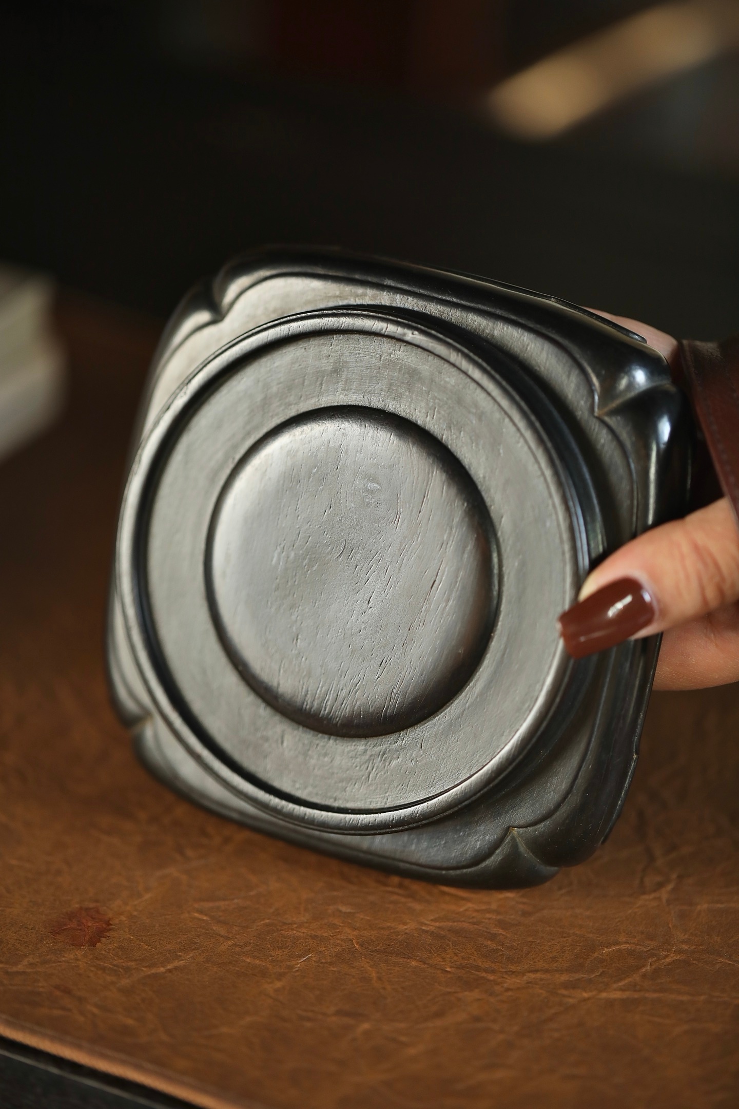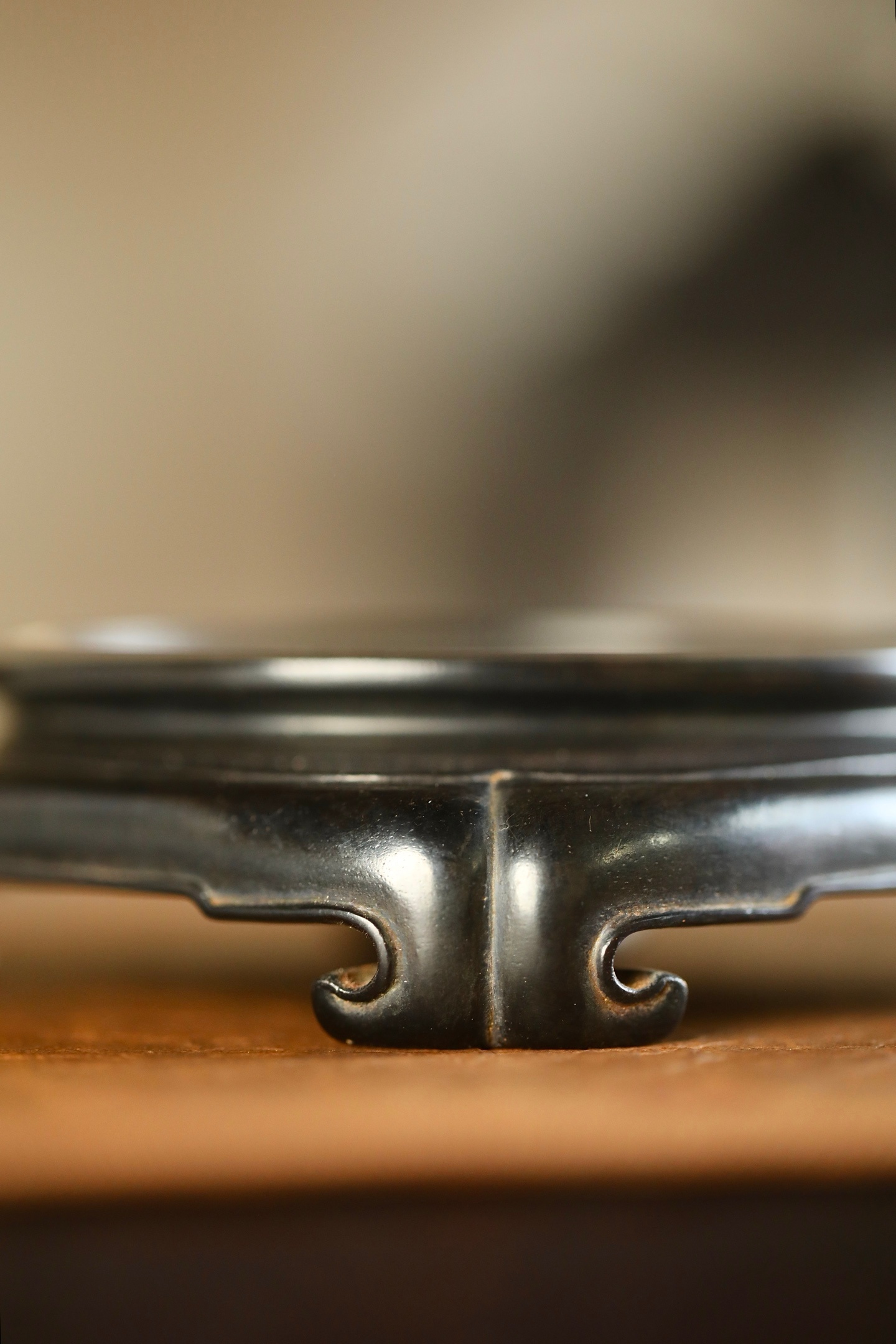 紫檀 | 底座取老料整雕,四方器形做海棠口弧边,层层旋纹收束出圆承面,木质坚密沉润,纹理隐于墨色中。承托瓷壶、雅石皆相宜,一器立稳,便让案头清供更具章法。12.8×12.9×3.5cm