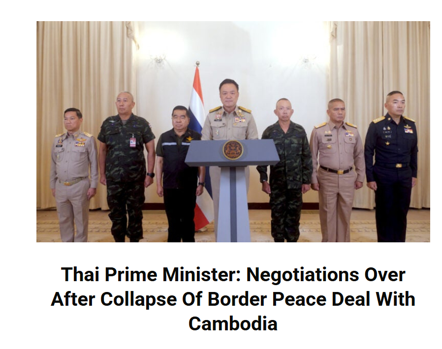 👉🏻泰国总理阿努廷·查恩维拉库周一宣布,大约两个月前签署、由马来西亚和美国共同保障的柬埔寨和平条约现已无效,并下令关闭所有与柬埔寨的额外谈判渠道。泰柬冲突 👉🏻查恩维拉库尔在政府大厦的新闻发布会上说。“从现在起,绝不允许任何形式的谈判。如果要停止战斗,柬埔寨必须遵循泰国所设定的行动路线。”👉🏻泰国皇家陆军参谋长柴亚普鲁克·杜昂帕帕特将军表示,“军队的目标是在未来长期削弱柬埔寨的军事能力,以保障我们的子孙安全。”👉🏻柬埔寨国防部发言人马利·索切塔说:“柬埔寨敦促泰国立即停止所有威胁该地区和平与稳定的敌对活动。”👉🏻柬埔寨信息部长内德·帕克达表示,泰国的军事袭击造成至少4名柬埔寨平民死亡,9人受伤。他指责曼谷“广泛传播虚假和捏造的信息”。👉🏻截至周一上午,特朗普政府尚未发表评论,但泰国总理暗示曼谷不会寻求第三方外交来解决最新一轮敌对行动。泰国总理称不会与柬埔寨进行谈判