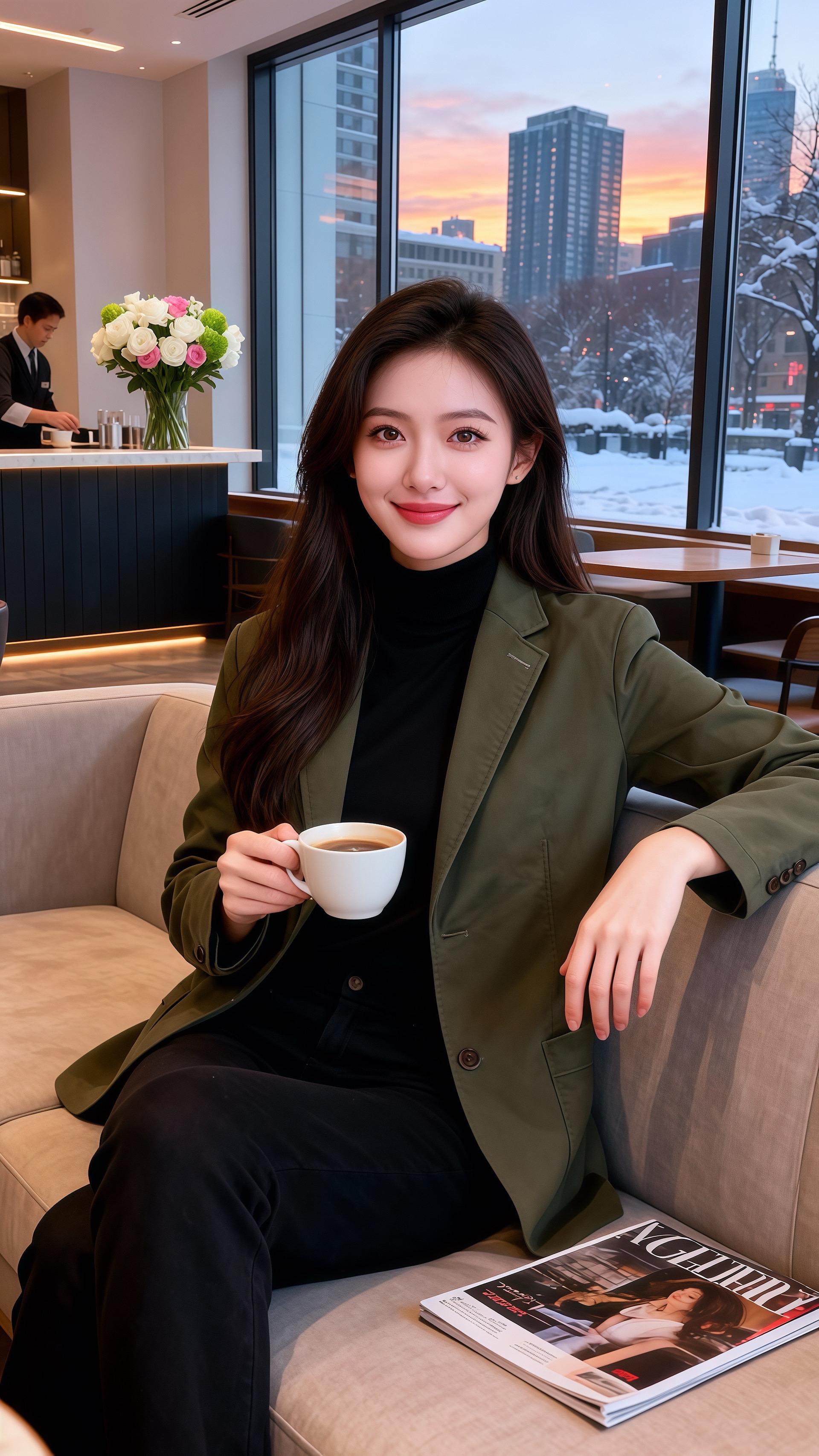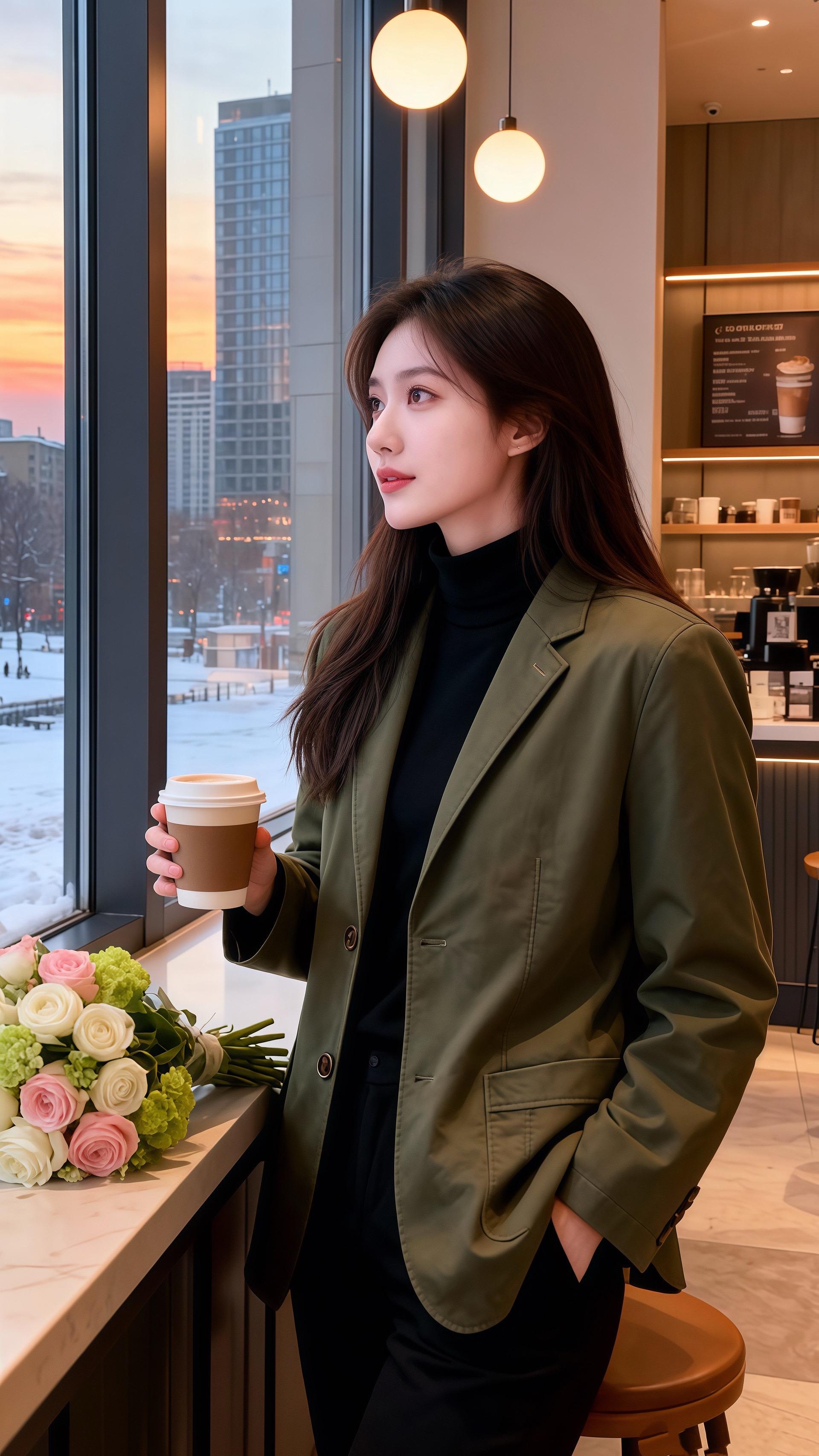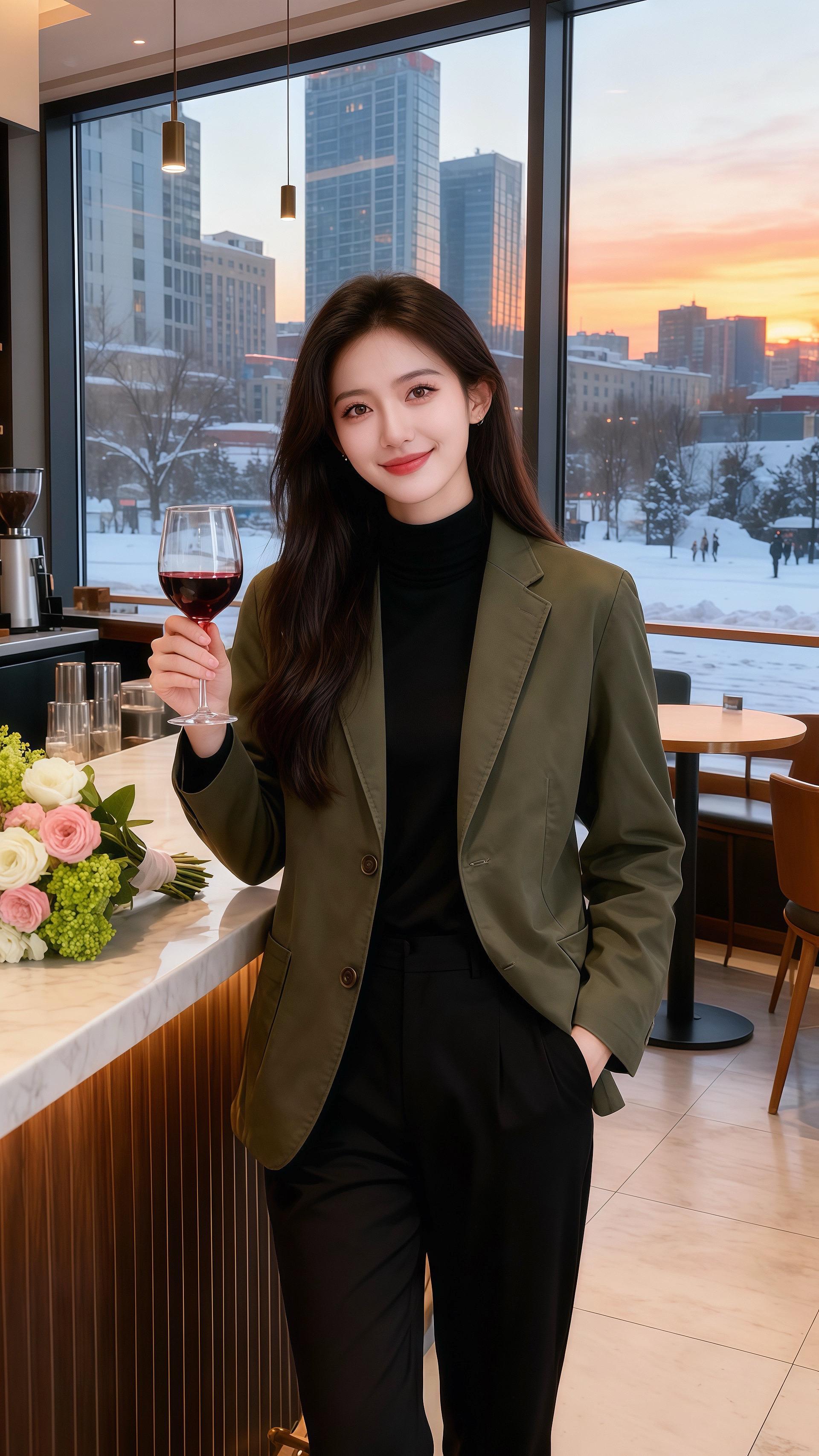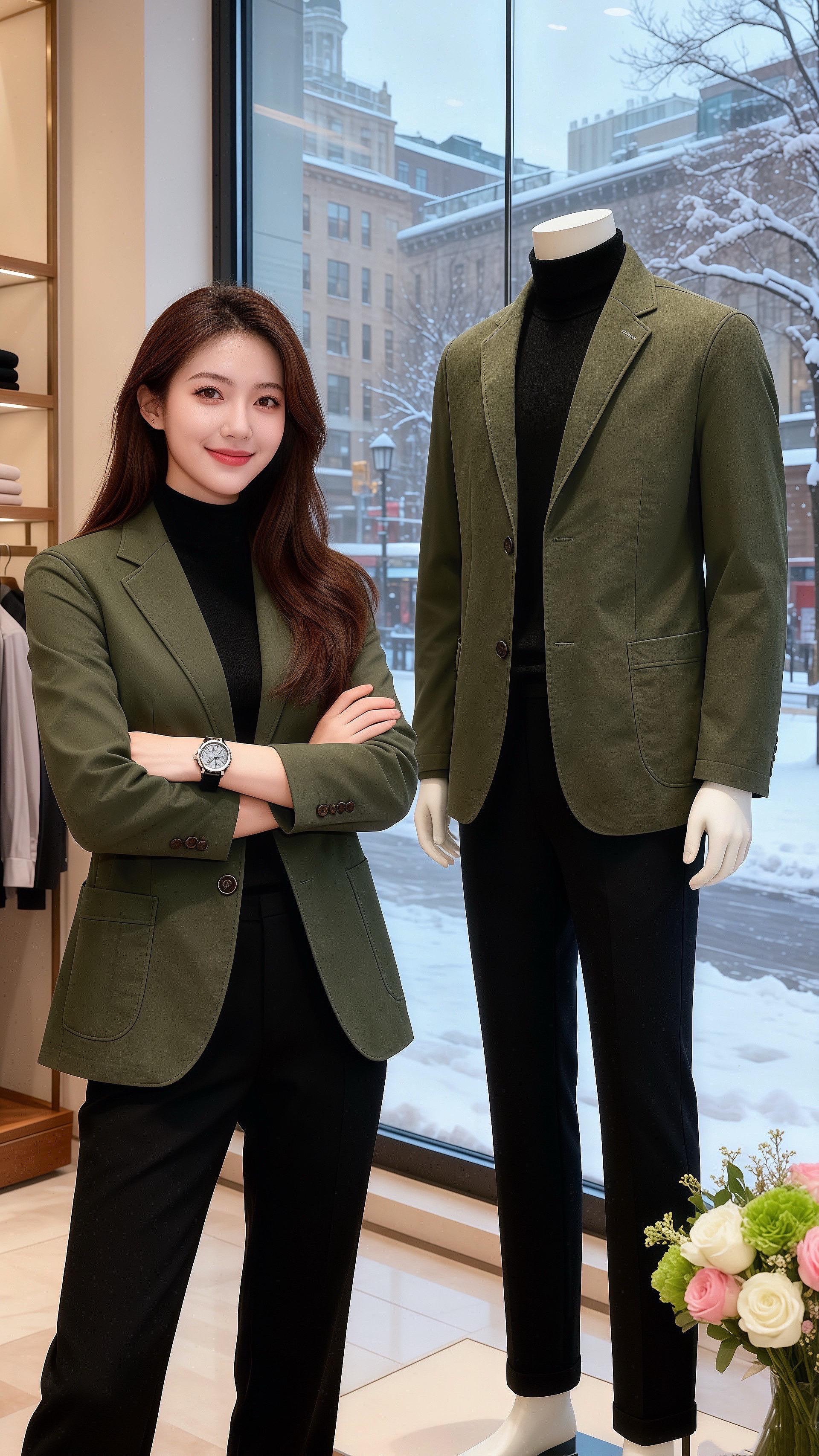 她穿墨绿色休闲西装,面料带着细腻的哑光质感,简约的单排扣版型衬得肩线利落,翻领设计添了几分干练的温柔。内搭黑色高领衫,沉黑与墨绿相撞,衬得气质愈发沉稳;下配黑色长裤,裤型挺括却不生硬,和西装的简约风格呼应,整身穿搭像冬日里的抹茶拿铁,醇厚的绿糅合着黑的深邃,连桌旁的花束都成了灵动的点缀。