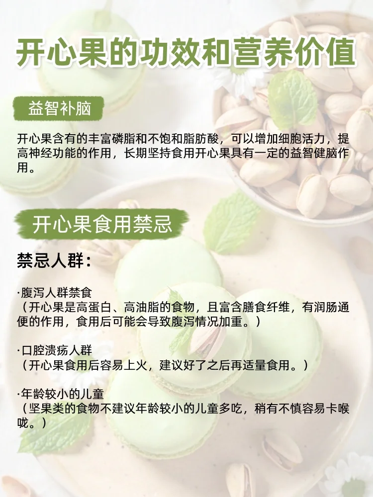 ⚠️腹泻人群禁食(开心果是高蛋白、高油脂的食物,且富含膳食纤维,有润肠通便的作用,食用后可能会导致腹泻情况加重。)