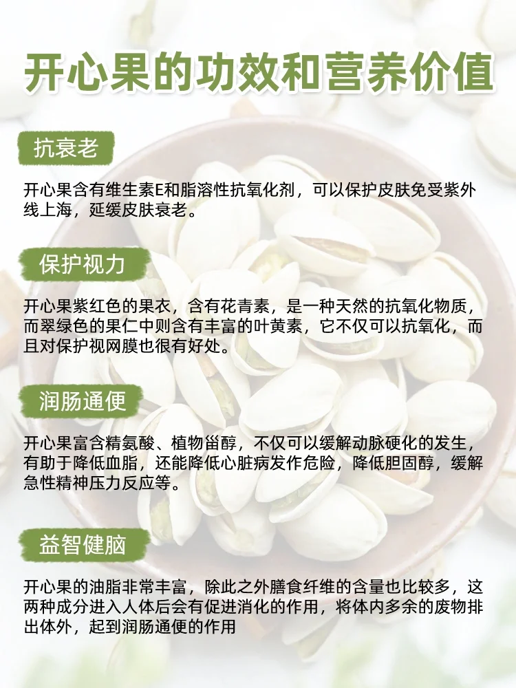 开心果含有维生素E和脂溶性抗氧化剂,可以保护皮肤免受紫外线伤害,延缓皮肤衰老。