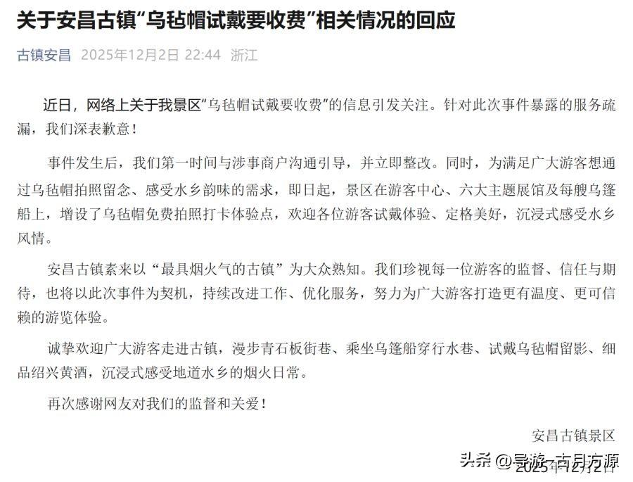 我只是试戴个帽子就要5块钱? 之前演员洪剑涛在绍兴安昌古镇试戴乌毡帽被索要5元费用一事终于出结果。 12月8日,洪剑涛发布致歉视频,坦言因不了解乌毡帽特殊材质产生误解,向店主阿婆及网友致歉,这场争议才得以平息。 事件源于洪剑涛拍摄时想试戴乌毡帽,店主施奶奶告知试戴需付5元,他将过程拍下上传后,网友看法两极:有人质疑他计较5元,也有人觉得店家收费不合理。但施奶奶道出苦衷:乌毡帽由优质羊毛经72道工序制成,试戴易吸附头油、导致版型受损,“人人试戴就没法卖了”,且店内早有收费提示牌,只是洪剑涛未留意。 安昌古镇景区随后紧急整改,增设免费试戴点并配备一次性头套,避免商品污染。据悉,洪剑涛后续在另一家店免费试戴后,以78元买下乌毡帽。