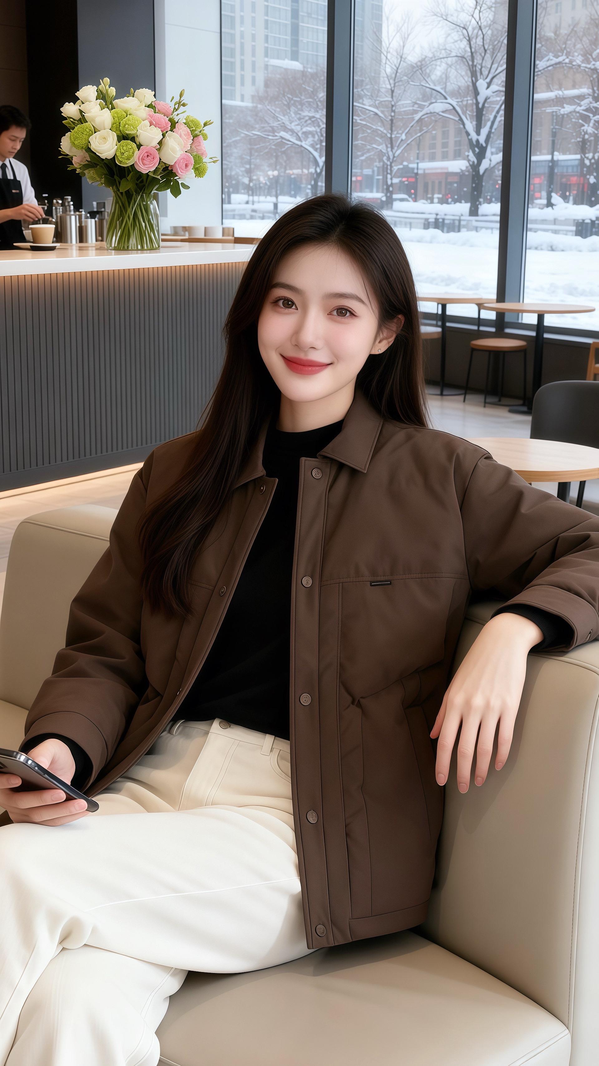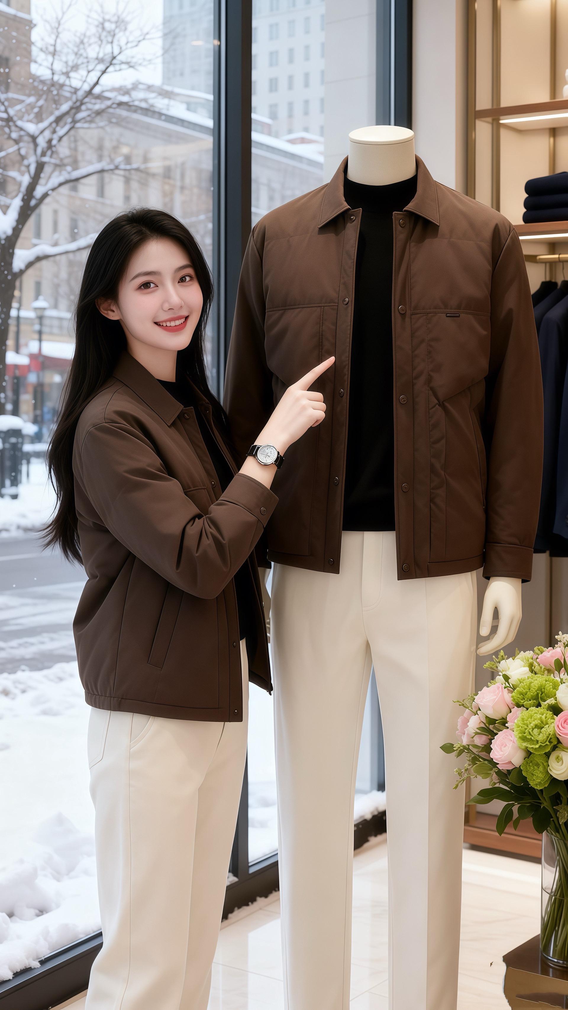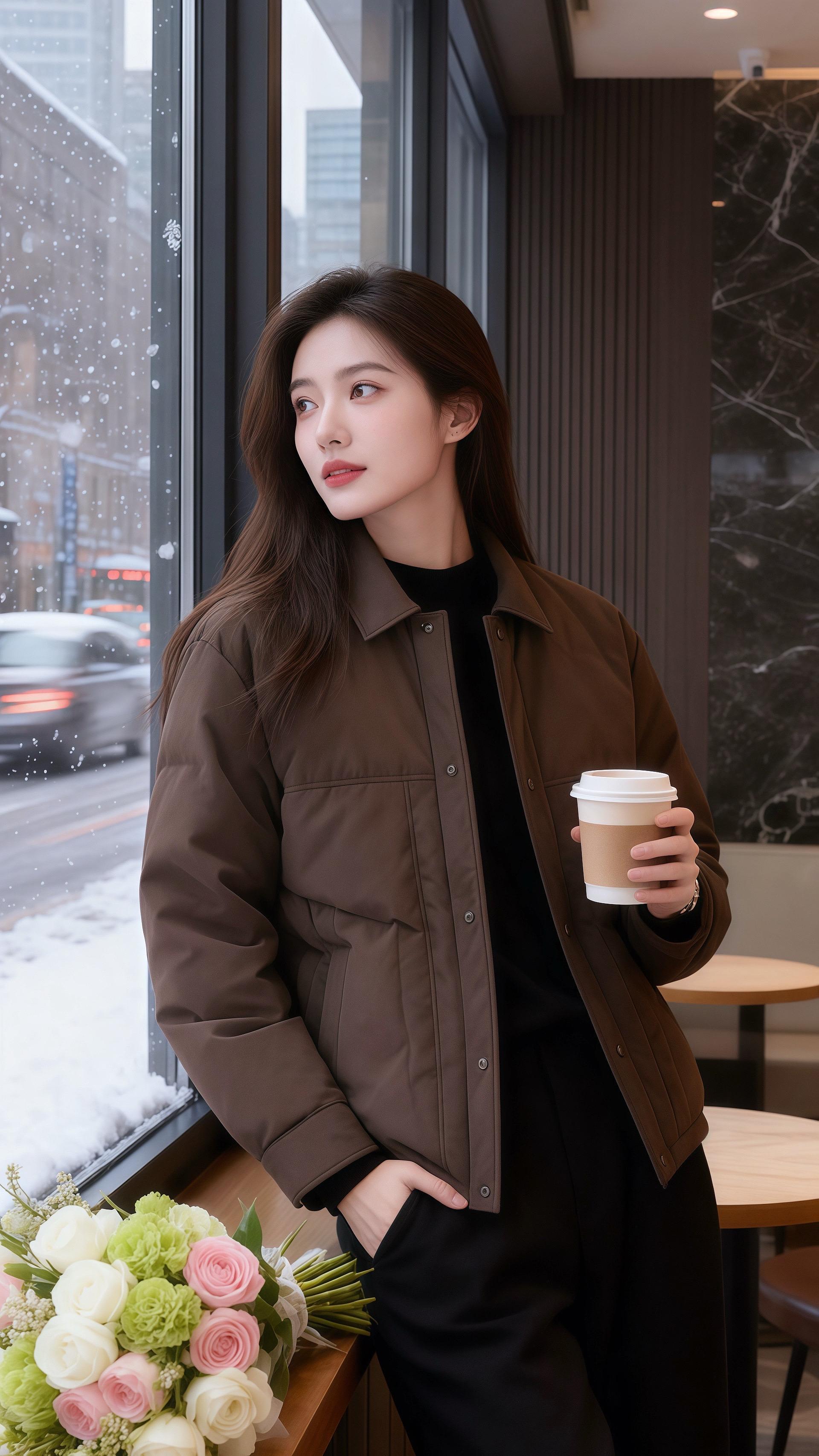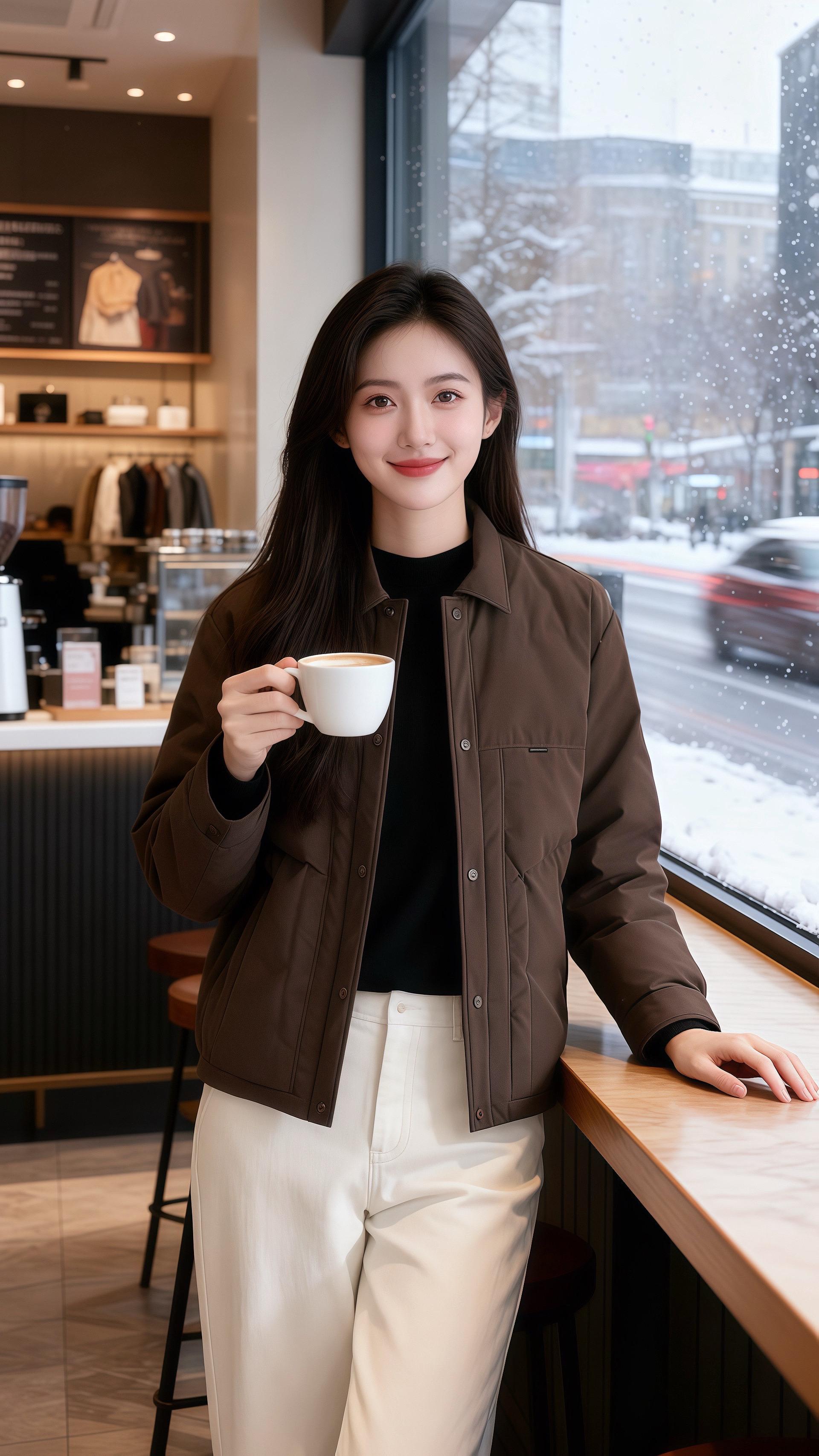 咖衫雪暖 北城的雪扑在玻璃窗上,皓明推开咖啡店的门,一眼就看见许妍坐在米色沙发上,指尖捏着手机,笑意浅浅地望过来。 她穿咖色翻领短外套,面料带着细腻的哑光质感,方形贴袋让衣身多了几分利落的设计感,单排纽扣顺着衣身排列,简约又大气。内搭黑色高领衫,衬得脖颈线条温婉,下装换了米白长裤与黑裤两款,米白裤的挺括中和了外套的厚重,黑裤则让整体搭配更显沉稳,整身穿搭像冬日里的手冲摩卡,醇厚的咖色裹着温柔的层次,连桌上的花束都成了点缀。 许妍抬头看到他,将手机放在一旁:「外面雪又大了些。」皓明走到她身边,替她拍掉发