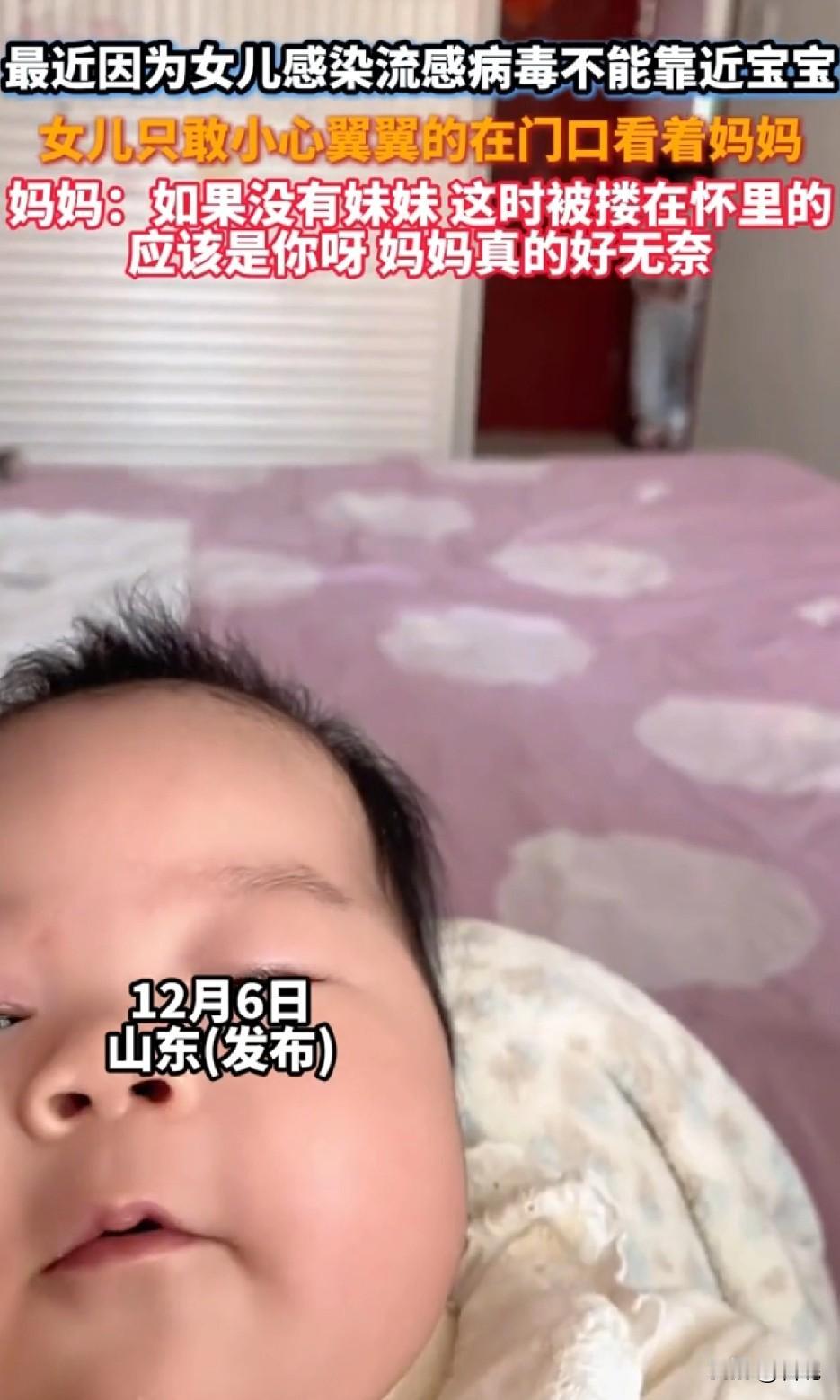 山东一女子晒视频称,因为大女儿感染流感不敢靠近妹妹,大女儿只敢小心翼翼在门口喊妈妈,看着妈妈。 小小的她小心翼翼,小小的她悄悄试探,小小的她手足无措,小小的她满眼期待,小小的她在喊妈妈……当妈的,最受不了这种表情,这种呼喊,感觉心都碎了。 生二胎的目的不是为了给姐姐找个伴,怎么姐姐变得更加孤单了?二胎出生了,姐姐连抱抱妈妈的勇气都没有了,那是多么可悲的事情。 在孩子心目中,尤其是生病的时候,难受的时候,特别需要就是妈妈。即便妹妹还是宝宝状态,即便需要母乳喂养,即便流感因素,但是妈妈连抱抱都不给姐姐,这真的是对姐姐公平吗? 房间里不行,妈妈出去抱抱,口罩带好,抱完酒精消毒也可以。姐姐好懂事,懂事得让人心疼! 二胎之间,当你觉得一碗水端不平的时候,就多倒点给老大,老大会帮你端平!