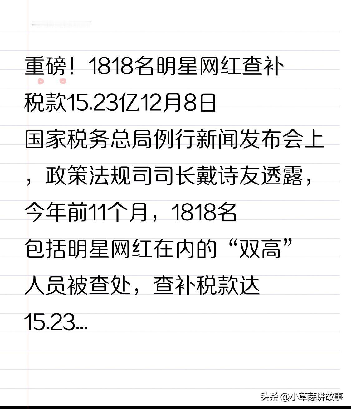 重磅!1818位明星网红查补税款达15.23亿 12月8日国家税务总局例行新闻发布会上,政策法规司司长戴诗友表示,今年前11个月,1818名包括明星网红的“双高”人员被查,查补税款15.23亿。同期查处3904户高风险加油站,查补41.63亿。1168户失信主体信用修复,超1300件检举无问题。税务监管发力,守护税收公平!