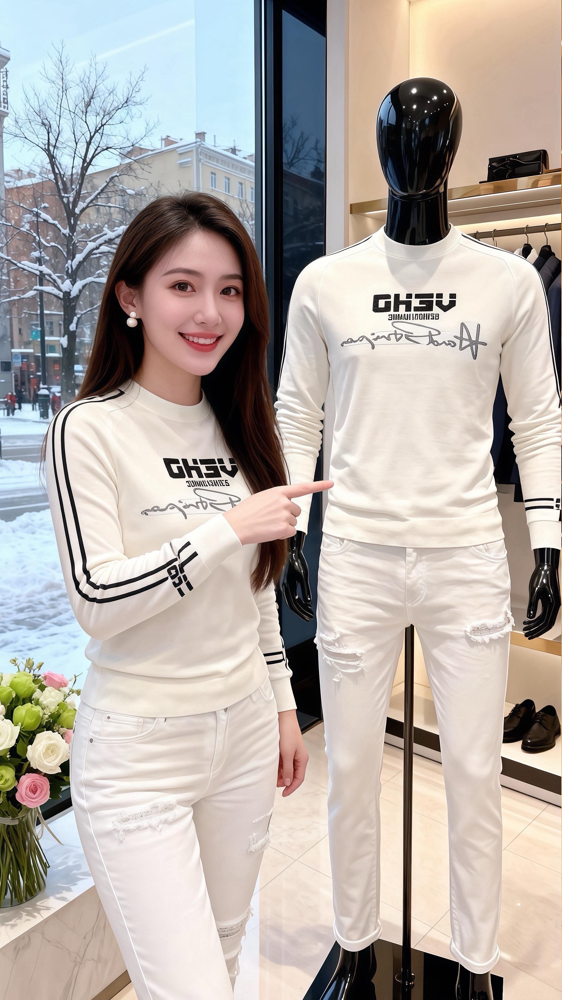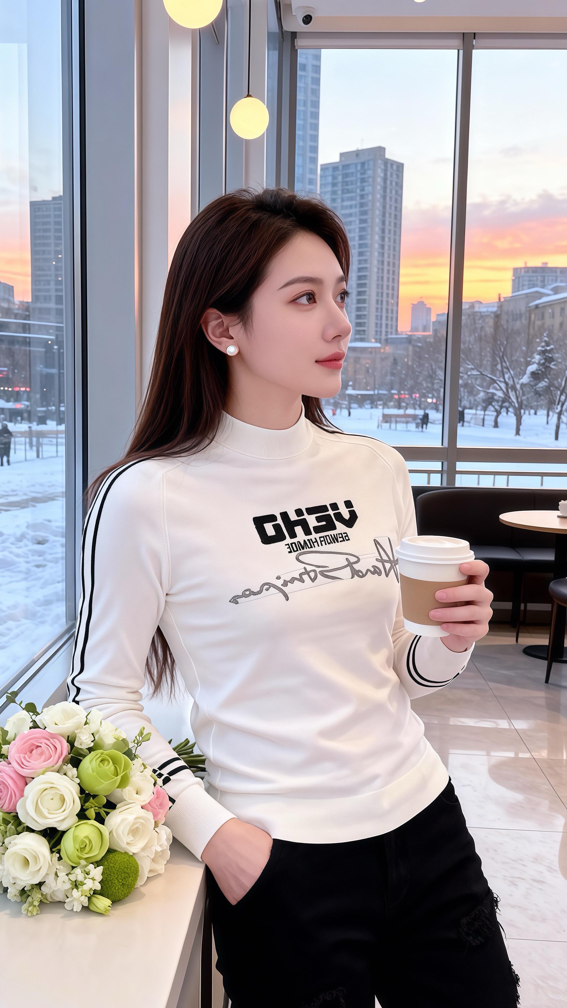 她穿白色半高领针织衫,柔糯的面料贴合身形,胸前的字母与手绘图案添了精巧的细节,袖子上的黑色条纹撞色利落,给纯净的白调添了几分酷感。下装换了白色破洞裤与黑色长裤两款,白裤的磨破纹路藏着随性,黑裤则让整体更显沉稳,整身穿搭像冬日里的鲜奶麻薯,清甜的白糅合着黑的利落,连桌旁的花束都成了灵动的点缀。