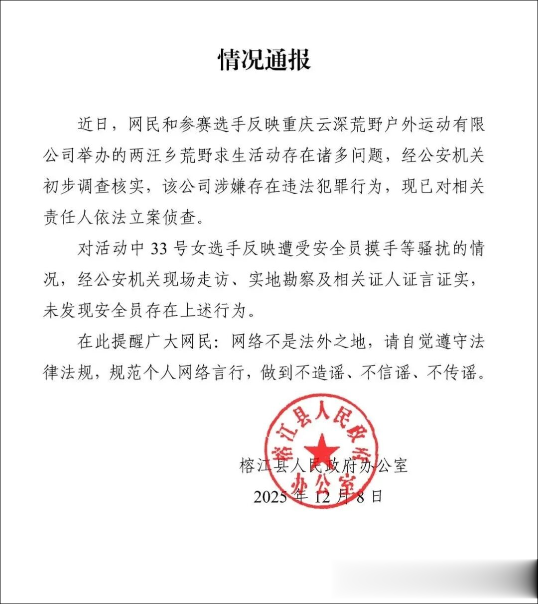 近日,网民和参赛选手反映重庆云深荒野户外运动有限公司举办的两汪乡荒野求生活动存在诸多问题,经公安机关初步调查核实,该公司涉嫌存在违法犯罪行为,现已对相关责任人依法立案侦查。