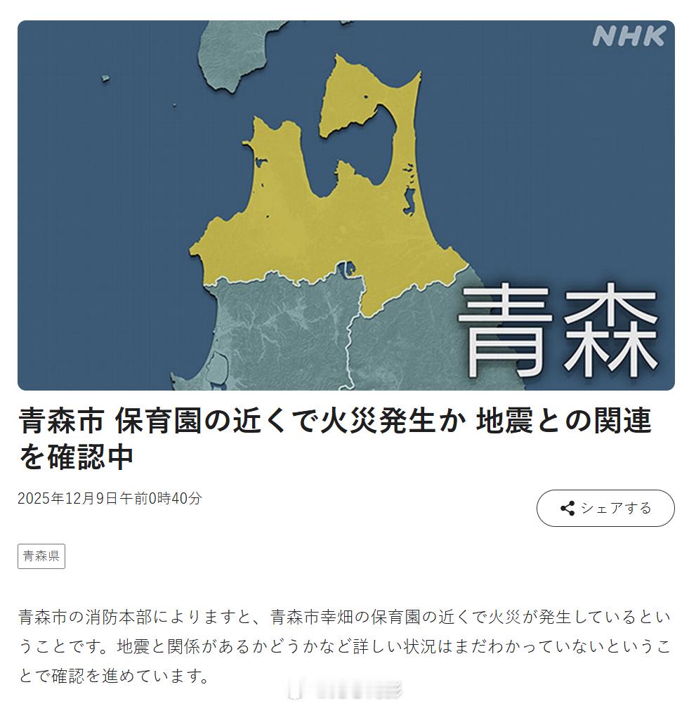 NHK报道称,青森市幼儿园附近疑似发生火灾,正在确认是否与地震有关海外新鲜事日本
