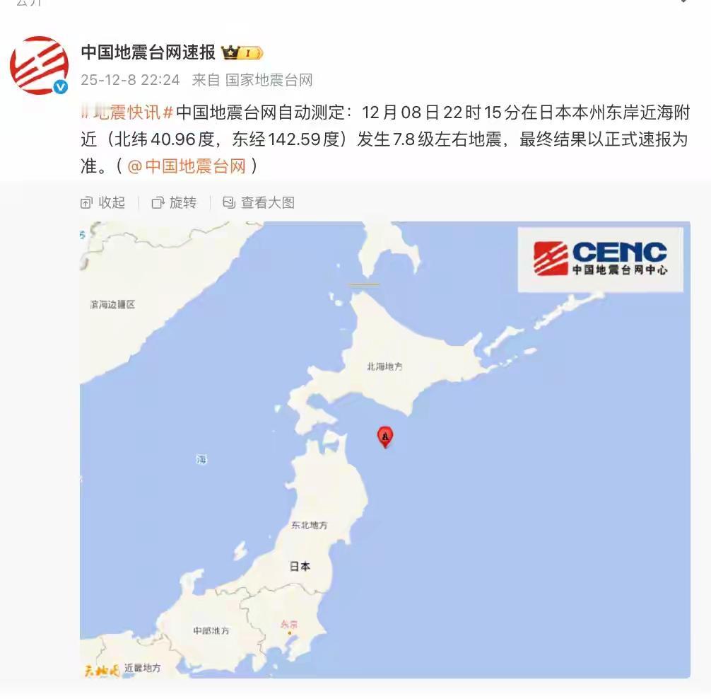 日本气象厅:预计部分海域将出现最高3米海啸,呼吁沿岸民众高度警戒。 日本气象厅当地时间12月8日23时23分发布海啸警报,预计部分海域将出现最高3米海啸,呼吁沿岸民众高度警戒。(CCTV国际时讯)