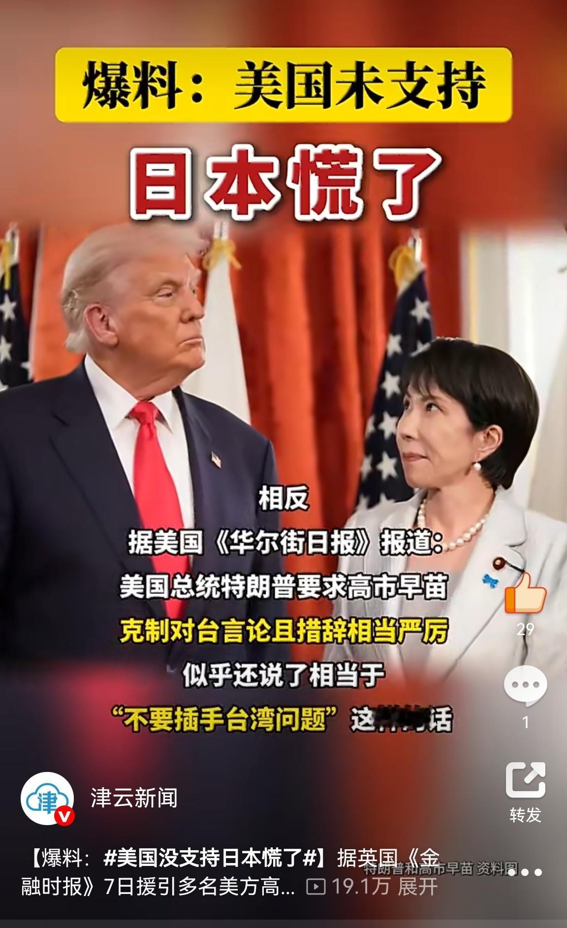 美日涉台博弈:棋子的妄想与霸主的算计特朗普对高市早苗的严厉敲打,揭开美日同盟的虚伪面纱。日本妄图借涉台挑衅绑定美国,重拾军国主义野心,却忘了自己不过是美方棋盘上的棋子。特朗普的“不要插手”,绝非维护中国主权,而是怕日本冒进打乱其战略布局,断了自身利益链条。高市早苗避谈涉台议题的窘迫,恰是日本外交从属地位的缩影。台湾问题是中国内政,岂容他人置喙?美日无论如何勾连博弈,都改变不了一个中国的事实。任何挑衅中国核心利益的行径,终将在历史大势面前自食恶果。特朗普高市早苗涉台通话内容曝光特朗普要求高市早苗不要挑衅中国