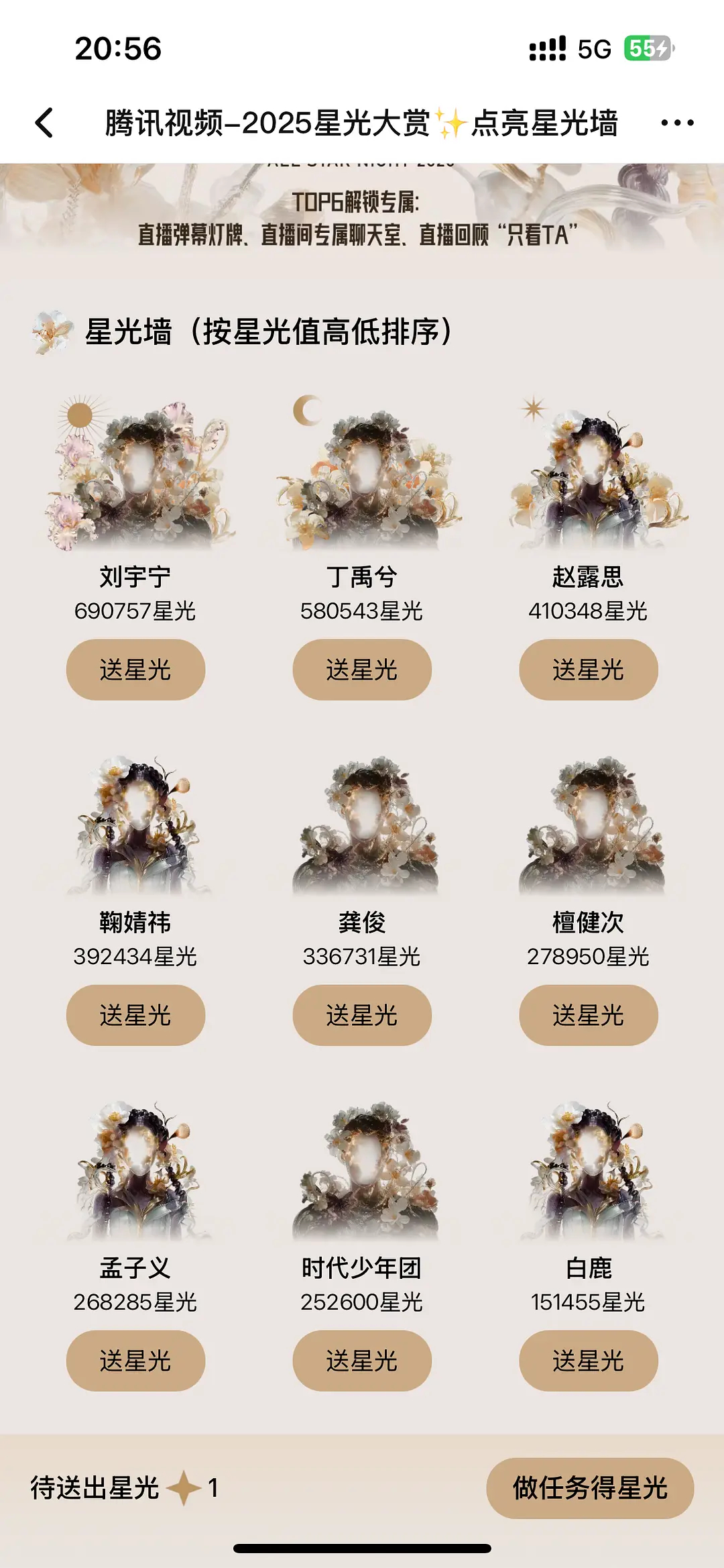 星光大赏星光墙前六是被架起来了,势必要争个输赢,但是距离结束还有六天,粉丝要累死了