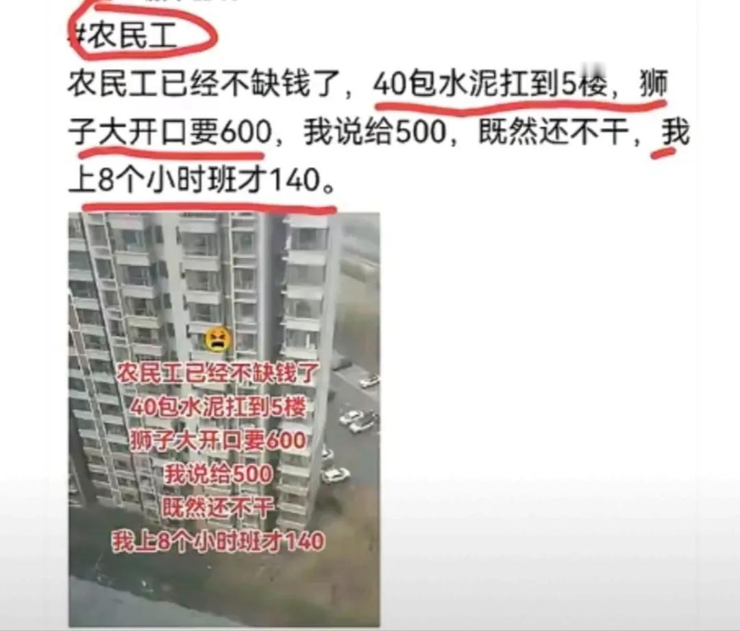 一个一天收入才140的,嫌600贵了又怎么了? 有网友发了这么一个图,吐槽了一下水泥搬运费,40包水泥,5楼,收费600。于是招来一大波指责。 说得最多的是,就是那句嫌贵你自己搬啊?其实,讲道理就不会说这话。农民工的辛劳,农民工的重要,大家都知道,不用谁来装圣母。但是也不见得世界上所有的活农民工都能干吧?就发这贴网友8小时140的活,农民工也未必干得了;当然同时也得承认农民工的活,不是人人都能干。发贴的网友身份估且认为是个职员吧,要是农民工的活他也能干,这600他也能挣,那估计又该被说不给农民工活路了。 只是根据各自的所长,社会的分工不同而已,有文化的实现文化的价值;有体力的实现体力的价值。换句话说,农民工需要同情,8小时挣140的也不容易,也需要同情。