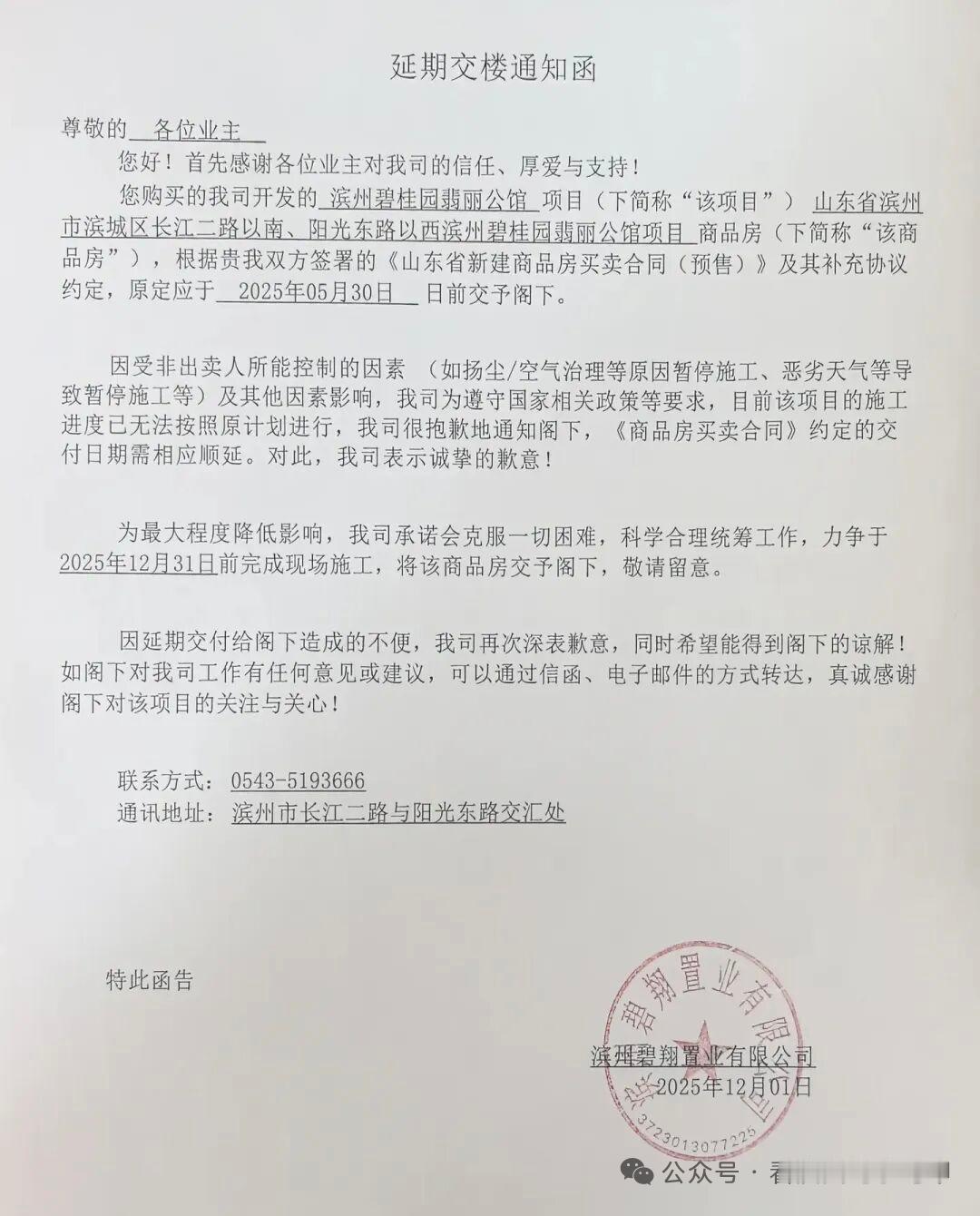 滨州一开发商通知延期 近日,山东滨州碧翔置业向业主发《通知函》。(下图) 该开发商表示,滨州碧桂园翡丽公馆项目原定应于2025年05月30日交付,因受非出卖人所能控制的因素(如扬尘/空气治理等原因暂停施工、恶劣天气等导致暂停施工等)及其他因素影响,开发公司为遵守国家相关政策等要求,目前该项目的施工进度已无法按照原计划进行,故通知《商品房买卖合同》约定的交付日期需相应顺延。 力争于2025年12月31日前完成现场施工,将该商品房交付给业主...... 来源 看滨州