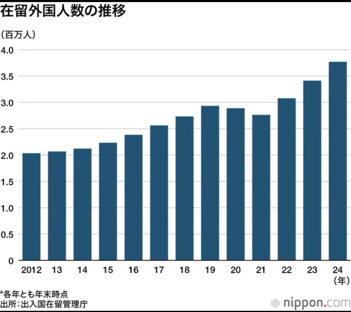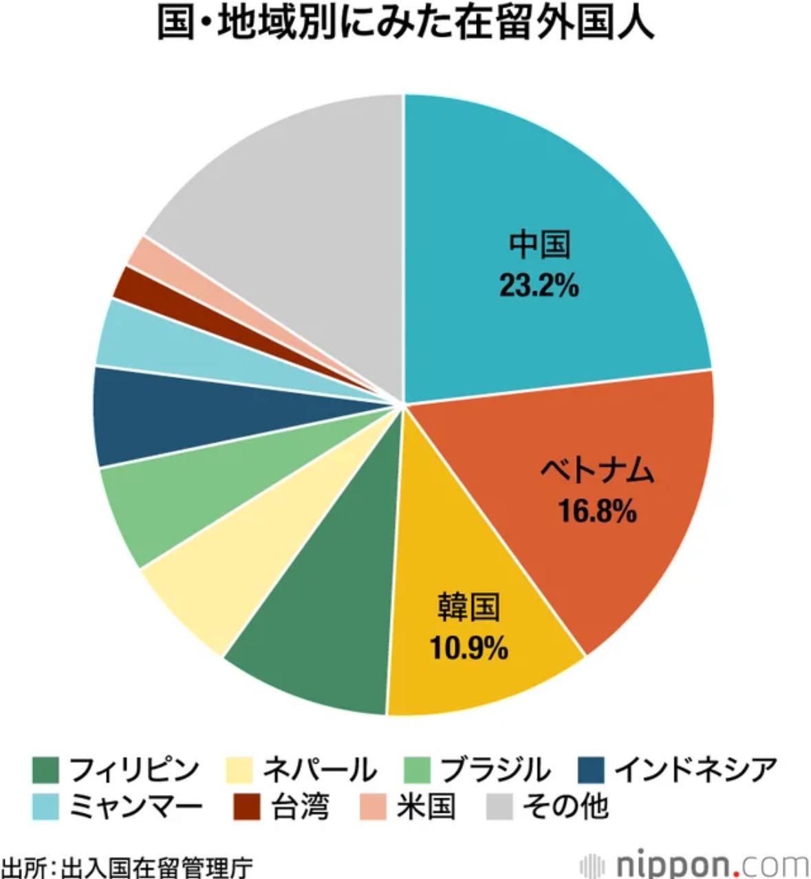 据日本出入国在留管理庁发布的最新数据,2024年末日本在留外国人376万8977人,前年同期比增加35万7985人(10.5%)。3年连续更新历史最高记录。 其中男性191万3516人(50.8%)、女性185万5431人(49.2%)、还有其他性别的30人。在留资格別永住者最多、比前年同期增加2万6547人増达91万8116人。向出身国技术转移目的的技能实习(研修生)同比增5万2039人为45万6595人、留学的同比6万1251人为40万2134人。 出身国・地区別,中国大陆87万3286人、越南63万4361人、韩国40万9238人。越南增幅最大前年比増加人数6万9335人。Top10国・地区里韩国以外都是前年同期比増加,尼泊尔取代巴西进入第五。 在留外国人住的地方最多的是东京都73万8946人(前年同期比11.4%増)占日本全国19.6%,其次大阪府33万3564人、爱知县33万1733人、神奈川县29万2450人、埼玉县26万2382人。