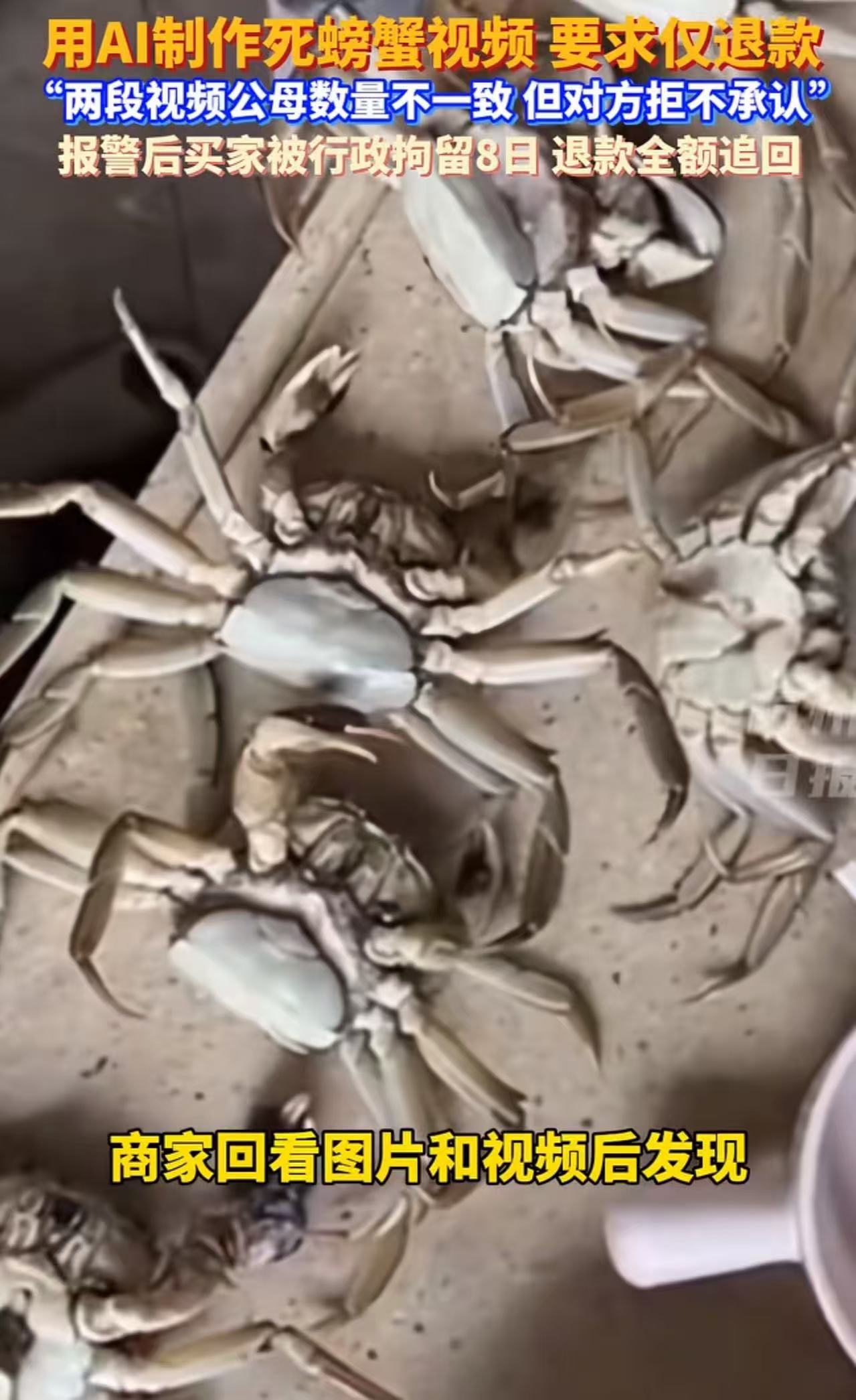 “大快人心!这次白嫖党栽了!”一买家自作聪明,用AI生成死螃蟹视频申请仅退款,被行政拘留8日!原来,AI 生成的视频足以以假乱真,卖家一开始真的被骗了,把钱退给了买家。但卖家后来发现视频里有个破绽,选择了报案!网友:又馋又穷又坏,全占了!
