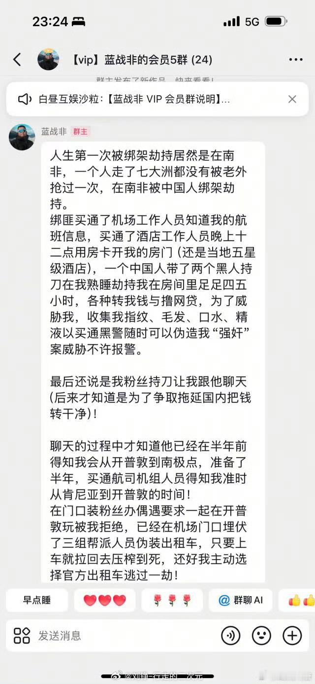 蓝战非称被绑架 蓝战非被绑架昨天深夜刷到的消息,只能说绑匪精心策划,而且从机场落地开始,一步步,一次次,这个手段并不稀奇,过去在南非旅游和从事相关工作时候耳濡目染很多,但是针对国人的直接绑架还是不多的,恐怕蓄谋已久!大家出门旅游务必做好防护,不必要的张扬尽可能自控,一切安全第一。还好现在人没事……刘浪小报告走进非洲 北京