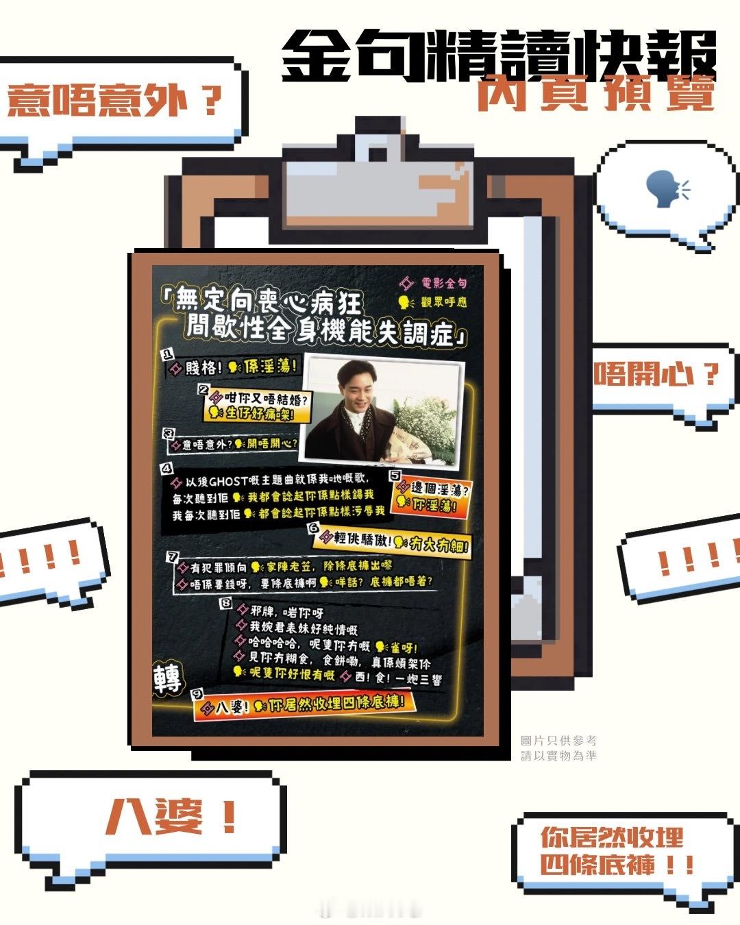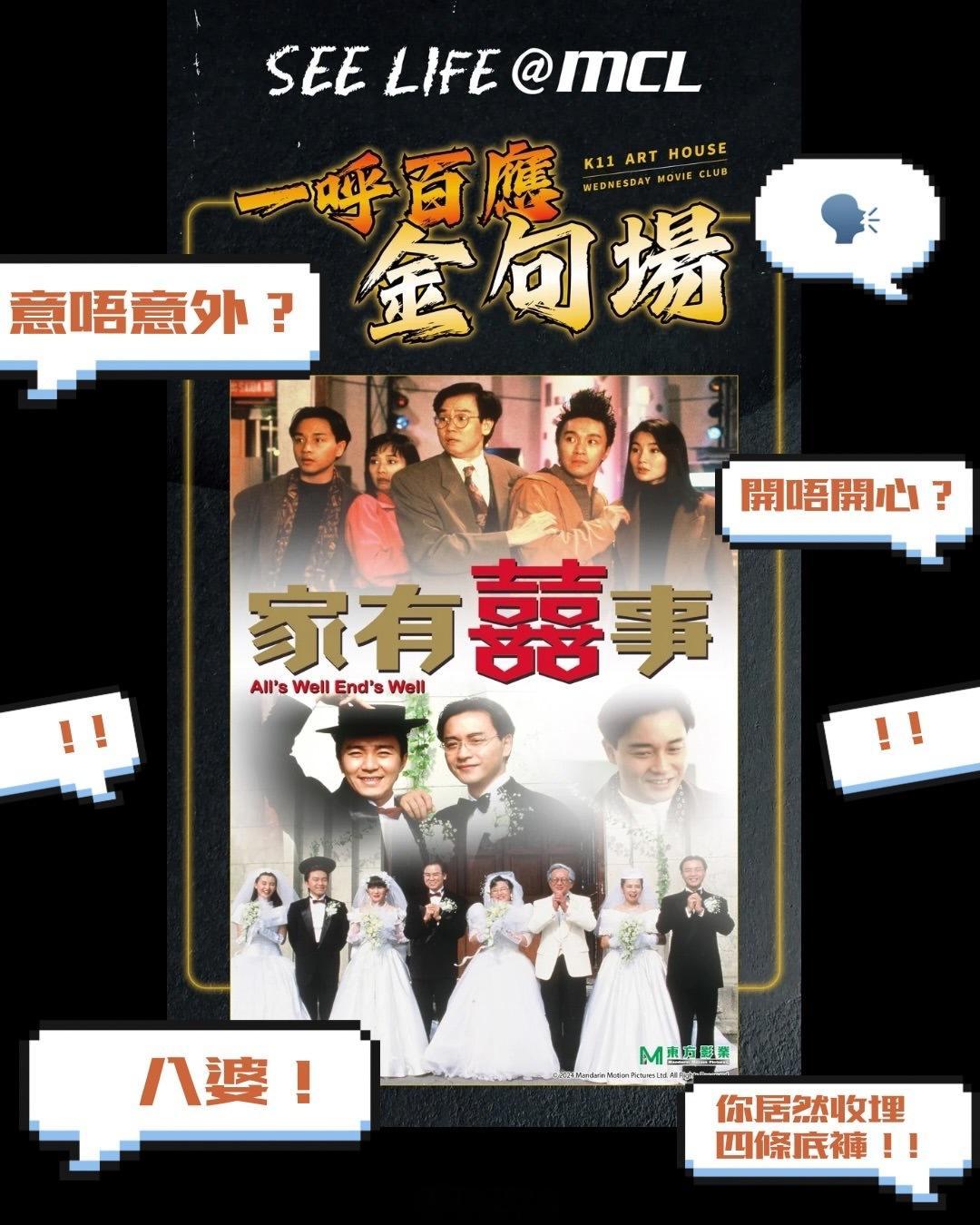 张国荣影讯 😳「意唔意外?开唔开心?」🤨「…又系你呀陈生!」大湾区的影迷别错过!香港MCL戏院的“Wednesday Movie Club”栏目,开启观众“一呼百应金句场”,星期三,12月10日,展映张国荣张国荣 、周星驰、张曼玉、吴君如、毛舜筠主演【家有喜事】4K修复完整版,打头阵❣️~跨年电影愿 一百个人心目中有一百句【家有喜事】金句,但有时偏偏话到口边背唔出😎 MCL特制金句精读快报,特别列出本片其中12大checkpoint,为入场观众打返个底:到咗银幕中人讲到相关对白🎥,就系各位观众和应🗣️嘅好时机!记得提早到埗,可以现场拎埋这套电影专属嘅金句精读快报📝,入场嗌返够本。《家有禧事》 (4K修复原装版)📍K11 Art House📌10/12 (星期三)19:50 - 尚余少量座位🔴📌27/12 (星期六)12:30 - 加开场次🟢