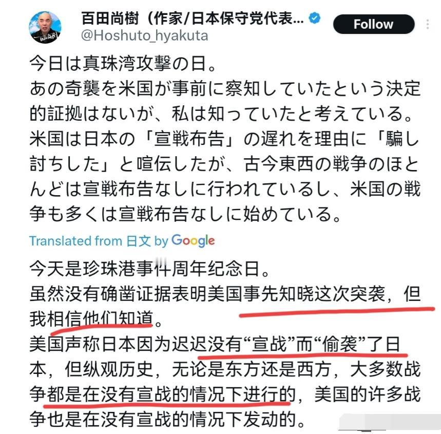 日本开始翻案了!12月8日,日本作家百田尚树公开表示,今天是珍珠港事件纪念日。虽然没有确凿证据证明美国事先察觉了那次奇袭,但我就是觉得他们早就知道了。美国拿日本“宣战公告延迟”当借口,大肆宣扬日本“不宣而战、搞偷袭”,可古今中外的战争大多是没宣战就开打,美国自己发动的战争也好多是不宣而战的。 很显然,估计美国也没有想到,在日本偷袭珍珠港84年后的今天,日本国内有人公开出来翻案了。而这种行为背后藏着清晰的逻辑漏洞与明确的主观意图,绝非偶然的言论发声。 了解百田尚树的过往便可知,他本就长期游走于否认侵略历史的边缘,早年间担任 NHK 经营委员时,就曾公开宣称南京大屠杀是 “蒋介石的宣传”,不存在这回事,还被美国驻日使馆批评为 “缺乏常识”,后来更因发表 “女性 30 岁后就该绝育” 等极端言论引发国际谴责。 这样一个一贯无视事实、热衷发表争议言论的人,其对珍珠港事件的解读本就带有强烈的预设立场,而非客观的历史回溯。 他所谓 “美国事先察觉奇袭” 的说法,完全建立在 “我就是觉得” 的主观臆断上,连他自己都承认 “没有确凿证据”。 事实上,关于美国是否事先知情的争议早有定论,即便当时美国通过 “魔术” 计划破译了部分日本外交密码,知晓其可能对美采取行动,也无法确定具体的攻击地点与时间,更不存在 “早就知道” 却放任不管的情况。 中国密码专家池步洲在 1941 年 12 月 3 日就曾破译日军密电,推测其可能于周日偷袭珍珠港,并通过蒋介石通报美方。 但美方因低估中国的破译能力未予重视,这一细节恰恰说明美国对具体偷袭计划并不知情,百田尚树仅凭主观猜测就推翻历史定论,本质上是用个人臆想取代严谨的史料考证。 至于他混淆 “宣战公告延迟” 与 “不宣而战” 的界限,更是对历史事实的刻意歪曲。日本作为 1907 年《海牙公约》的签字国,明确承诺战争前需正式宣战,山本五十六最初也要求宣战书在偷袭前 30 分钟提交美方,以规避 “偷袭” 骂名。 但由于日本驻美大使馆工作人员打字效率低下,这份五千多字的宣战书直到珍珠港遭袭 55 分钟后才送达美国国务卿手中,这一过程有明确的时间线记录,日本外务省后来也不得不将其解释为 “大使馆的失职”。 可见,日本的 “不宣而战” 是铁证如山的事实,绝非百田尚树口中可随意模糊的 “延迟” 问题,他试图用行政失误掩盖军事行动的本质,恰恰暴露了翻案的刻意性。 更荒谬的是,他以 “美国也有不宣而战的行动” 为由,主张日本的偷袭不该被指责,这完全是偷换概念的逻辑陷阱。 珍珠港事件是日本主动对当时处于中立状态的美国发动的大规模军事突袭,造成 2400 多名美国人丧生、1250 人受伤,炸沉炸伤数十艘军舰和上百架飞机,这种针对军事基地和无辜人员的突然攻击,与美国在不同历史背景下的军事行动有着本质区别。 更何况,即便其他国家存在类似行为,也绝不能成为日本开脱自身侵略罪责的理由,就像偷窃者不能以 “别人也偷过东西” 为由证明自己无罪,百田尚树的这种论证方式,本质上是在回避日本发动侵略战争的主观恶意。 百田尚树的言论并非孤立存在,而是日本国内历史修正主义思潮蔓延的缩影。 二战后美国因冷战需求放松对日本战争责任的清算,导致右翼势力重新活跃,从篡改教科书将 “侵略” 改为 “进出”,到政客频繁参拜靖国神社,再到否认慰安妇、南京大屠杀等罪行,这些行为都在试图重构历史叙事,将日本从 “加害者” 塑造成 “受害者”。 百田尚树对珍珠港事件的翻案,正是这种思潮的延续,目的是通过淡化日本的偷袭行为,逐步消解其侵略历史的沉重性,为日本的军事扩张铺路。 即便美国如今与日本保持盟友关系,面对这样的翻案言论也必然感到刺耳,因为珍珠港事件是美国的国耻,当年的伤亡与损失是无法抹去的历史记忆,杜鲁门总统当年就曾明确指出日本的 “无警告攻击” 是使用原子弹的原因之一。 历史事实不会因主观臆断而改变,日本当年为打破战略封锁、推行扩张野心,早已通过间谍详尽搜集珍珠港美军动向,选择星期日发动袭击的周密计划,都证明了偷袭的蓄谋已久。 百田尚树的翻案言论,终究只是对历史事实的徒劳挑战,既无法改变日本不宣而战的本质,也无法掩盖其侵略战争的历史罪责,反而让国际社会更清晰地看到日本历史修正主义的危险倾向。