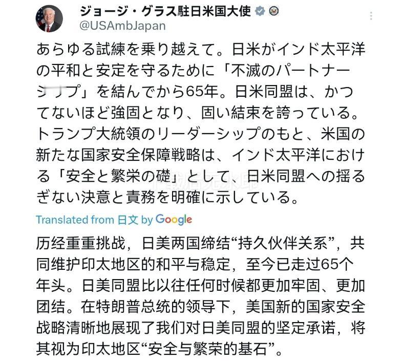 美国出来表态了! 在中日发生所谓的雷达照射日本战机一事之后,12月8日,美国驻日本大使声称,历经重重挑战,日美两国缔结“持久伙伴关系”,共同维护印太地区的和平与稳定,至今已走过65个年头。日美同盟比以往任何时候都更加牢固、更加团结。 一直以来,这位美国大使在对中国的问题上可没少发声,说话很直接,立场也是出了名的强硬。大家本来想着,这次中日间闹成这样,美国肯定要帮日本说两句,顺势批评一下中国。 可没想到回答却变了样,竟然只是在重复友谊和盟友的故事。这样一来,反倒让日本有点摸不着头脑,觉得美国这次格外“低调”,不像之前那么勇猛了。 其实要说美国为什么这么做,很大一部分原因是因为美国自身的利益盘算。美国明白,在这个节点上贸然表态,很容易让事情变得更加复杂。对美国来说,自己手里还攥着印太的全盘棋,没必要在中日的小摩擦上替日本出头。 稳住日本的心,同时避免得罪中国,这才是美国想要的效果。再加上美国眼下有太多自己的事,也不愿意被这一摊事牵扯太深。所以,美方这次发言才格外小心翼翼,怎么都不露锋芒。 日本的感受就完全不一样了,看着美国一句中国都没说,日本心里的落差可想而知。他们原本期待美国能更坚定地在背后撑腰,最好能直接替他们去敲打中国一番。 可谁知道,等来的只是一堆套话和承诺,什么“同盟比过去更强”、“伙伴关系牢不可破”,这些听起来让人没底气。 对日本来说,这样的表态就像冬天等炭火,结果谁都只会说一句“多穿点”,一点实在的帮忙都没有。 外界也都能看出来,美国这波操作其实是在划清界限,他们只是想让日本稳着点,不要搞得太大。而日本则不得不重新衡量,这种盟友关系到底还值不值得一直托付。 被美国晾在一边,日本的情绪慢慢变得复杂,既有被冷落的失落,也有对未来的不安。毕竟在大是大非面前,不是每一次都能等来盟友的出手,人家更多时候想的还是自己那点事。 说到底美国大使嘴里常说的“基石”,听起来很有分量,但是本质上这块“基石”到底稳不稳,全看美国是不是愿意为日本冒风险。 嘴上的盟约终归比不过实际的行动,大家都清楚美国只要得不到好处,那“基石”也会变得松动。日本通过这事也算是明白了,自己在美国棋盘上有价值的时候才会被重视,别的时间只能靠自己。 这场风波就像一面镜子,照出了同盟关系的真相。美日之间的纽带表面看着挺紧密,关键时刻能有多少真心,有时候还真得打个问号。 美国这次“撑腰”的姿势,最后让日本在关键关头感觉到了冷清,而未来这样的场面大概率还会上演。