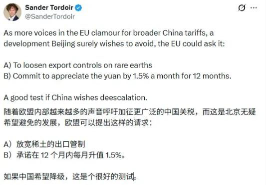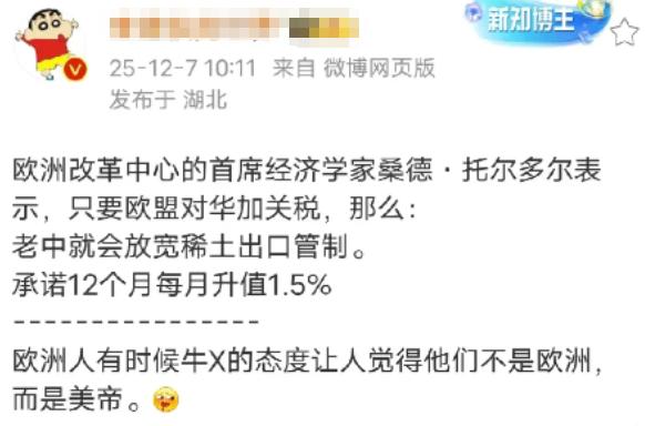 不仅欧洲政客天真,连欧洲的精英都还活在幻想里,欧洲经济学家称中国必须答应欧洲两个条件,一个就是放宽稀土出口管制,一个是连续12个月人民币升值,每个月升值1.5%,要不然就要面对欧洲的加征关税,然后这个欧洲经济学家还幻想中国一定不希望升级,所以只要欧洲虚空造牌,威胁要加征关税,我们就会答应欧洲这两个条件,就这样凭空让中国退让了! 先说他们盯着的稀土出口,以为只要威胁加关税,中国就会乖乖松开管制。可他们忘了,中国手里的稀土不是简单的矿产品,而是捏着全球高端制造的七寸。 2025年我们给三家企业发通用许可证,看似松绑,实则划了红线——特斯拉、宝马的订单能走绿色通道,军工相关的门都没有。 海关的数据明摆着,中重稀土的出口审批还攥在手里,镝、铽这些关键元素的出口量,比管制前还少了30%。 欧洲车企嚷嚷着供应链紧张,可德国博世的采购经理私下说,现在买中国磁材得签"最终用户承诺",连边角料流向都要报备,这种精准管控下,想靠关税逼中国全面放开?做梦呢。 再说人民币升值,这帮经济学家算的是12个月每月1.5%的账,可他们根本不懂人民币现在的底气从哪来。 2025年中国GDP增长5.3%,出口逆势涨了5.3%,外资买A股砸了506亿美元,这些都是人民币走强的硬支撑。央行连续12个月囤黄金,储备量破了2300吨,说白了就是手里有锚,不怕美元折腾。 欧洲非要把汇率当武器,却忘了2024年他们自己被美国"对等关税"揍得满地找牙时,人民币逆势成了避险货币。 现在美联储降息预期85%,美元指数跌穿100,人民币跟着走强是市场选择,岂是按月划指标能逼出来的?上个月在岸人民币破7.06时,外资一天就买了22亿,这种内生动力,欧洲拿关税吓唬谁呢? 最要命的是欧洲的产业空心化。他们盯着中国电动车占欧洲市场55%的份额,却不提自己的汽车厂因为能源危机关掉了多少。 2024年欧盟对中国电动车加征反补贴税,结果比亚迪直接在匈牙利建厂,关税成本变成了本地就业,反而倒逼欧洲产业链重组。 稀土方面更惨,全球90%的中重稀土分离产能在中国,欧洲试过自己搞,罗马尼亚的稀土项目刚开工就因为污染被环保组织叫停——他们一边要绿色转型,一边舍不得治污的钱,这种矛盾,靠威胁中国能解决? 欧洲经济学家的幻想,根子在误判了中国的政策逻辑。稀土管制不是不让出口,而是要把资源攥在高技术手里。2025年拿到通用许可证的企业,清一色掌握晶界扩散、氢碎这些核心工艺,中小厂商根本没资格玩。 人民币升值也不是怕贸易战,而是借着经济基本面重塑汇率定价权。当欧洲还在用20年前的"市场换技术"思维看中国时,中国的稀土回收技术已经能从电子垃圾里提取30%的稀土,无稀土电机研发进度比特斯拉还快两年。这种产业升级的速度,岂是加关税能挡住的? 更讽刺的是,欧洲自己正被美国的关税揍得团团转。2025年美国对欧盟加征20%关税,德国汽车出口直接掉了12%,这时候他们想起找中国要市场,却又放不下身段。 马克龙访华时带着一堆企业求合作,转头欧盟就对中国光伏加税,这种矛盾操作,让中国企业彻底看穿——欧洲想要的不是公平贸易,而是单方面的让利。可中国现在的稀土出口,70%流向新能源汽车和机器人这些高端领域,欧洲想用关税逼中国回到卖初级矿的时代,门都没有。 说到底,欧洲经济学家的逻辑漏洞在于,他们把中国当成了2008年的日本——以为靠汇率和关税大棒就能逼退。可他们忘了,中国手里握着全球最大的稀土产业链,人民币国际化有黄金储备打底,产业链韧性更是经历过疫情考验。 当欧洲还在算"挖泥船100年挖不完黄河"的账时,中国早就在稀土回收、无稀土技术上开辟了新赛道。这种降维打击,岂是虚张声势的关税威胁能招架的?欧洲如果真以为靠"虚空造牌"就能让中国退让,怕是要在现实里碰得头破血流。