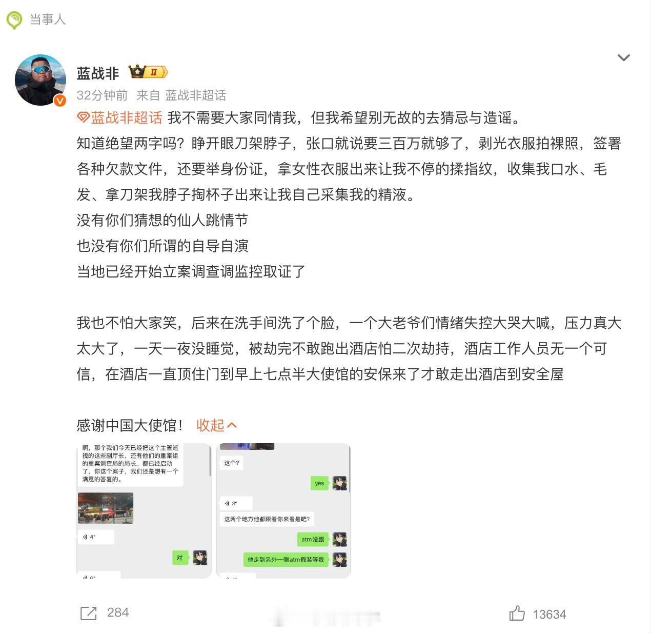 蓝战非回应南非被绑架看文字都觉得可怕:1、密谋计划半年绑架2、刀架脖子,剥光衣服拍裸照3、举身份证拍照4、勒索钱财300万5、签署各种欠款文件......希望大家出门在外都平平安安,多注意安全!财不露眼,个人行程不要随便泄露出去! 蓝战非称被绑架
