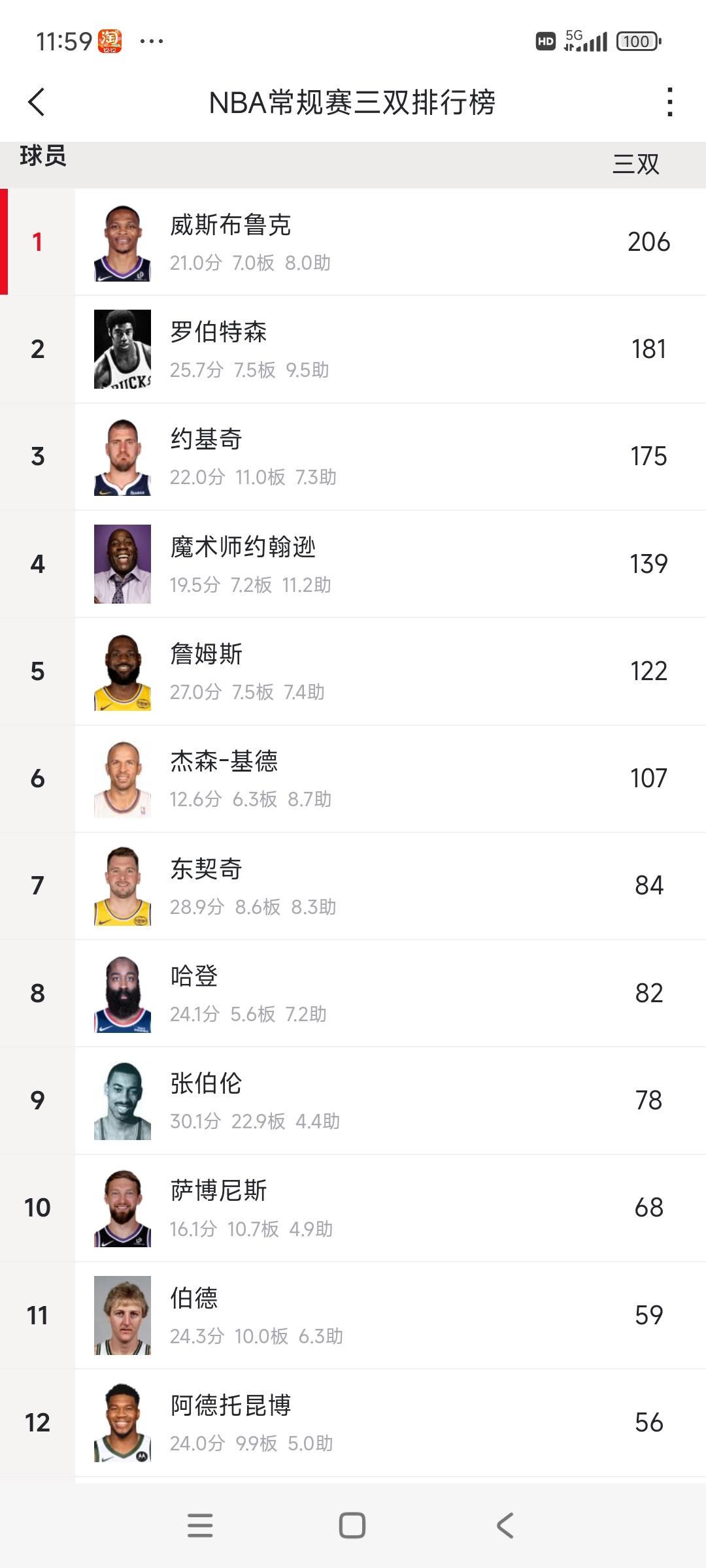威少第207次三双来了,本赛季才4次,他身感压力巨大! 想保持第一,就得尽量往上提高。 约基奇175次马上排名历史第二。 詹姆斯122次应该追不上,历史前五就不错了。 东契奇84次,职业生涯能追上老詹? 现在威少一个赛季10次三双差不多了,约基奇是每个赛季场均三双,太猛啦!![捂脸]